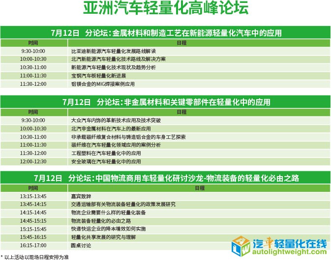 领航轻量化新趋势 此次高峰论坛还将开设金属材料与工艺、非金属材料与关键零部件、物流商用车轻量化三个专业主题分论坛。专业、精准地对接乘用车和商用车轻量化发展需求,以技术之名,为汽车产业赋能,共同探寻轻量化新技术产业发展的现实路径。 论坛日程安排: 聆听终端声音:分论坛将有来自上汽大众、北汽吉普、北汽新能源、比亚迪等多家主机厂的专家来新能源轻量化技术路径、内外饰轻量化技术方案、轻量化新材料应用方案等方面的分享。 聚焦新材料新工艺:来自宝钢、科思创、伏能士、福建海源、和氏璧化工、富晟汽车等多家单位将分别从高强度钢、安全玻璃、碳纤维复合材料、高性能工程塑料、铝镁合金焊接等方面带来最新的技术分享。 助推商用车轻量化:商用车由于特殊的承载要求,其整车质量一般远远高于乘用车。因此,商用车的轻量化之路更显艰难。此次活动,主办方别具匠心地开设了中国物流商用车轻量化研讨沙龙。邀请交通和商用车领域权威专家,以及圆通、申通、京东、优速、跨越等众多知名物流企业领导,共同谋划物流商用车轻量化的发展之路。 论坛亮点三:多形式交流