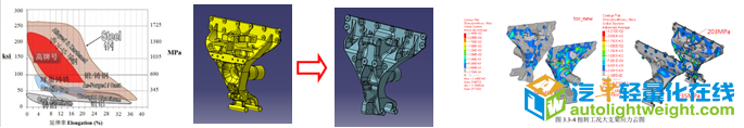 参评技术:高强高韧球墨铸铁在卡车底盘上的应用研究 技术简介 近年来,中重卡市场的竞争日益加剧,行业内对产品轻量化的要求也越来越高,特别是GB1589法规治超新政下,最低的整备质量已成为各主机厂极力追求的目标,为此,各主机厂陆续通过技术创新升级对主要产品进行了更新换代。降低整车的成本和重量,减少市场故障率,以提高产品核心竞争力,增大市场占有率。 原牵引车G20平衡轴(120kg断开式),制定轻量化开发目标:①开发高强高韧材料QT800-5;②充分结合CAE拓扑分析,对结构进行优化设计。优化后断开式平衡轴81kg/件。最终达成效益,整车降重:88kg/车,同时成本降低32元/车。 整车降重:223.8kg/车,同时成本降低470元/车。 在此开发的基础上,以平衡轴为中心将QT800-5高牌号球铁材料全平台拓展运用,同时结合车架连接方式的优化改进,开发系列化轻量型平衡轴,最终实现整车降重降成本: 采用高强高韧材料QT800-5结构优化后,大支架降重3kg/件;托臂梁降重11kg/件。目前正在调件装车,以6×4车型为例,最终实现整车降重50kg/车。 高强高韧材料QT800-5,直接铸造成型,不需要进行热处理,提高生产效率、降低成本,通过合理的匹配碳硅及钼镍等合金元素,获得了较好的珠光体组织,其中延伸率提高到了5%,冲击焦耳达40J,屈服强度提高到了550Mpa,抗拉强度提高到了800Mpa。 小结 极大的实现了整车的轻量化,提高生产效率、降低成本,提升了产品竞争力: 1)G20平衡轴:截止目前已装车约7万台,合计降成本达224万元; 2)G30平衡轴:截止目前已装车约1万台,合计降成本达470万元。 是否产业化: 已量产 |