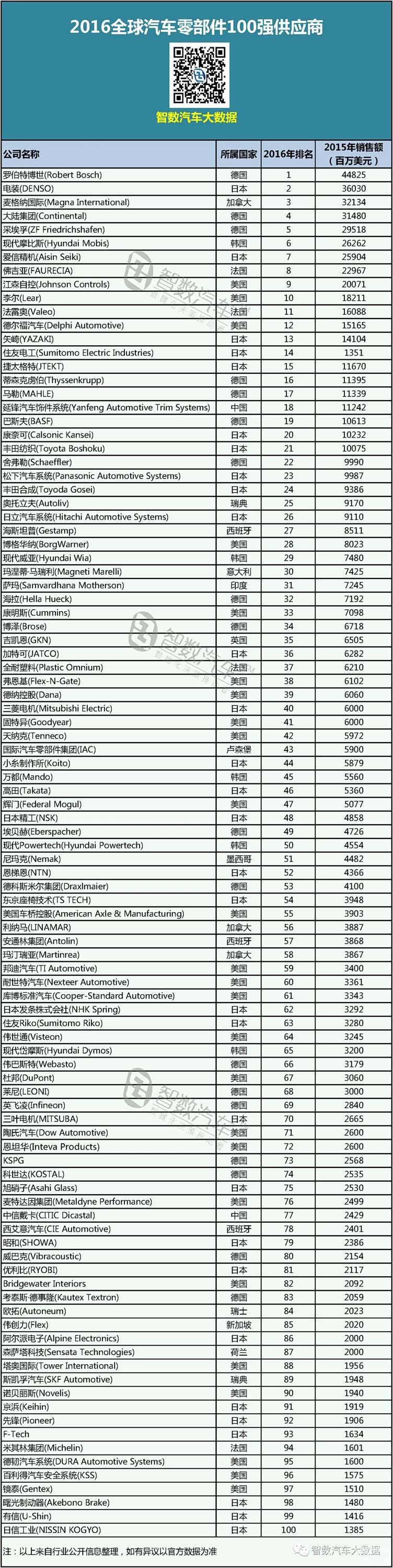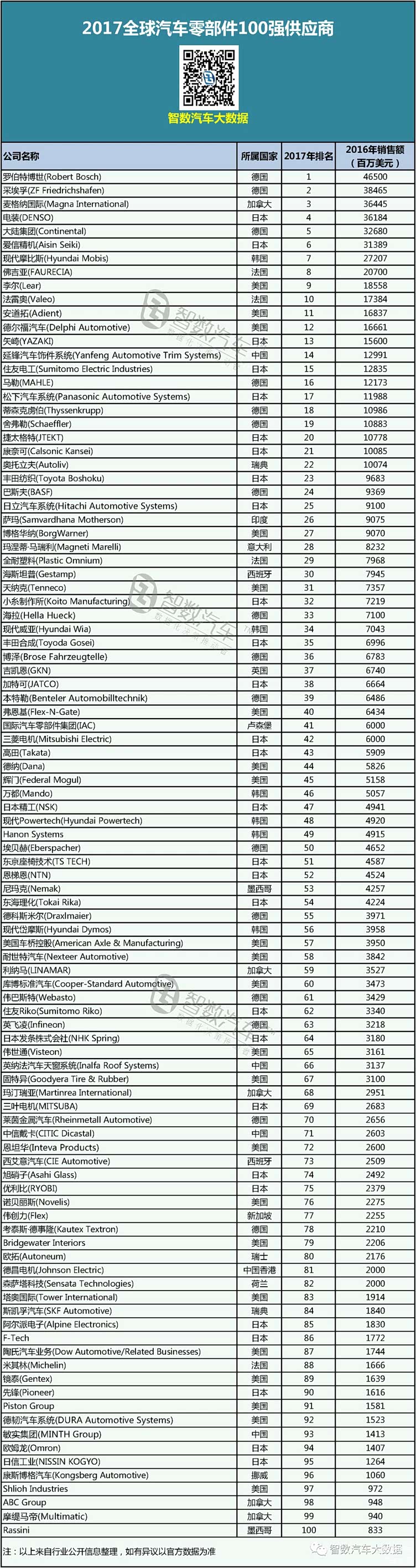 “全球汽车零部件配套供应商百强排行榜”是按照供应商上年汽车行业配套市场业务营业收入/销售额进行排名,整理的全球配套收入前100位的汽车零部件供应商榜单。 在新近发布的2018年全球汽车零部件配套供应商百强排行榜中,日本企业上榜数量最多,达到27家,其次为德国19家、美国18家。中国企业方面,中国(含香港地区)有六家企业上榜,其中延锋位列第16位,在中国企业中排名最高。 从2005年第一届榜单开始,迄今是第14届榜单揭晓。智数汽车基于数据梳理了近三年全球汽车零部件配套供应商百强榜,以供行业作对比分析使用。 2018年排行榜 ![]() 2017年排行榜 ![]() 2016年排行榜 ![]() |