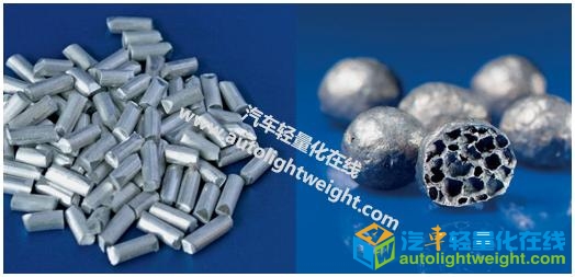 当前的趋势,如电动车的使用增加或金属加工行业中更灵活和资源效率更高的生产方法,对轻质结构提出了新的挑战。除了基于设计的解决方案之外,新的材料概念也必须为应对这些挑战做出贡献。 多孔和致密材料的组合目前用于多种产品中,例如,带泡沫芯的三明治,泡沫填充型材或碰撞吸收元件等。 泡沫结构产品主要用于低机械负荷的部件中。由于它们具有低密度、高质量比刚度的特点,并且碰撞时能够吸收大量变形和振动能量,因此它们有助于提升部件的整体性能。 除了大量生产的聚合物泡沫外,金属泡沫 - 特别是铝泡沫 - 已经在特殊领域得到应用。 聚合物泡沫和铝泡沫之间的主要区别在于较高的热稳定性和导电性,不同的热膨胀行为和金属泡沫的通常较高的强度和硬度。铝泡沫的缺点是原料成本较高和需要更精细的生产和成型工艺。与聚合物泡沫(铝:> 650°C)相比,铝的较高工艺温度导致更复杂的过程控制并降低生产率,尤其是在需要生产大型组件或具有复杂几何形状的组件时。在原位填充有泡沫铝的中空结构的情况下,高的工艺温度会导致部件材料的劣化。 与3-D泡沫组件或泡沫板相比,金属泡沫颗粒具有可以以简单灵活的方式生产,并且可以与聚合物,聚合物泡沫以及无机材料结合,从而产生创新的定制混合材料。 泡沫铝生产首先利用Foaminal技术:将铝粉与发泡剂混合,然后将混合物压制成"可发泡"前体。压实可以使用不同的工艺来完成,例如,挤压。然后将可发泡前体放入模具中并熔化。发泡剂的分解会使其膨胀并填充模具。凝固后,泡沫成品可以从模具中取出。 泡沫铝颗粒的生产与该方法的不同之处在于使用了线材形状的前体,图1.将线材切成小段,然后在连续带式炉中熔化和膨胀。从发泡剂释放的气体的内部压力和表面张力导致其形成近乎球形的颗粒。 在通过加热炉的不同加热区之后,颗粒冷却,固化并且可以分别收集进行进一步的处理,例如,涂层(使用球体的余热)。清洁颗粒表面并不是必要的,因为超过700°C的高过程温度会导致潜在污染物的分解;此外,颗粒表面的主要部分在膨胀阶段产生,因此本质上没有污染。随后的处理如例如颗粒与较大结构的结合可以毫无问题地完成。 Figure 1 Foamable precursor wire (left) and aluminium foam granules (right) (© Fraunhofer IFAM) 对于起泡颗粒,所有铝合金都是合适的,它们均可表现出良好的起泡行为并且可用作可发泡前体。 目前,颗粒生产主要基于合金AlSi10和氢化钛作为发泡剂。 颗粒的大小和密度通过合金原材料的线带和炉子设定的尺寸(区域温度,带速度)来调整。 典型的颗粒直径在1至12毫米之间,典型的真密度在0.55至0.7 g/cm3之间。 如果使用细长的线带,也可以生产非球形的颗粒。 开发用于塑造基于泡沫铝颗粒的复合材料的原始技术是先进孔隙形态学(APM)工艺,图2.在这里,发泡后立即用热活化粘合剂粉末(例如聚酰胺PA12或环氧树脂Araldite AT1-1)涂覆颗粒。之后,可倾倒的包衣颗粒可以粘合到3-D组分上。或者,它们可用于填充空心部件。粒状物的结合在120-190℃的中等温度下进行。 如果将额外的发泡剂混合到聚合物粉末中,则该过程将产生替代材料 - 聚合物铝混合泡沫,图2(右)。发泡剂在聚合物的热固化过程中释放气体,气体导致填充泡沫铝颗粒之间间隙的仍为软聚合物的发泡和膨胀。与原始APM变体相比,这种第二种方法的优点是当材料受到机械载荷时相邻颗粒之间的力的传递得到改善。