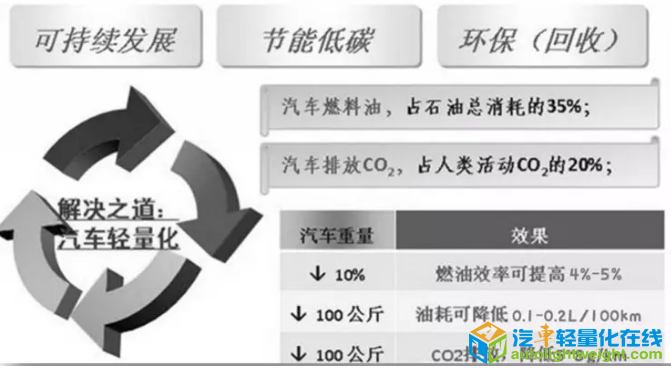【汽车轻量化在线】汽车轻量化是未来汽车发展的一大趋势,其意义在于保证汽车的强度和安全性能的前提下,尽可能地降低汽车的整备质量,从而提高汽车的动力性,减少燃料消耗,降低车辆排放。实验数据显示,汽车重量降低1%,油耗可降低0.4%-0.5%;汽车整车重量降低10%,燃油效率可提高4%-5%;汽车整备质量每减少100公斤,百公里油耗可降低0.1-0.2升。当前,由于环保和节能的需要,汽车的轻量化已经成为世界汽车发展的潮流。