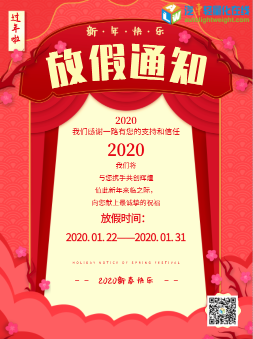 您们好! 律回春晖渐,万象始更新。我们将送走硕果累累的2019年,迎来充满希望和期待的2020年。 汽车轻量化在线全体员工深深地感谢大家长期以来对我们的关注与支持,再次向您致以最诚挚的祝福和问候!新的一年里我们会更加努力,以期给您提供更优质的内容与服务! 根据《2020年全国年节及纪念日放假办法》,结合我公司实际情况,现将2020年春节放假时间及工作安排公布如下: 1月22日(周三)-31日(周五)为春节放假,2月1日正常上班。放假期间,网站将延缓新闻内容更新与用户审核信息,所有会员功能如常使用,如给您带来不便还请谅解! 节日期间,如有人以本站客服名义,以系统升级为由,索要账号,密码请不要轻易提供,谨防受骗。 最后再次祝您,鼠年大吉,万事顺利! |