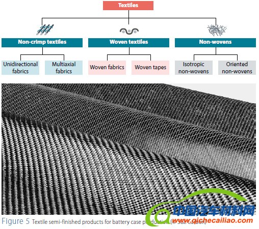 【汽车轻量化在线】为满足更加严苛的排放法规,汽车制造商正致力于开发可规模化生产的动力驱动系统。纯电动、混合动力、插电式混合动力、燃料电池等汽车类型将在未来的汽车市场中发挥越来越重要的作用。但是,目前电动车的续航还尚未达到汽油或柴油车的标准。电动车增加续航的方法一般有两种:一种是安装大容量储能系统,但这会增加车辆重量;另一种是选用高能量密度的储能材料,但是目前电池的能量密度还达不到应用需求。 此外,提高车辆整体效率是减少燃料消耗的有效方式。除了上述动力总成中的优化措施外,还需要通过减重来降低行驶阻力,从而实现节能减排。因此, 轻量化不仅是燃油车的需求,对电动车来说也非常重要。一般而言,重量减轻100公斤,可减少约10克/公里的二氧化碳排放量,最多可减少0.45升/100公里的油耗。对于电动车,电池包壳体的轻量化不仅可以使汽车高效运行,还将提供更大的续航。但是电池包壳体的设计在轻量化的同时,还需要尽可能地可靠和安全。这就需要考虑其防火安全性、刚性、热管理、电磁兼容性和抗 腐蚀性能等诸多因素。 当前,电动汽车的电池包壳体主要由铝和钢制成。相比之下,SGLCarbon开发的如图1所示的 复合材料电池盒可实现40%的减重,其相关机械性能对比如图2。 电池包壳体的底板和上盖的设计对于壳体的性能具有较大的影响。复合材料电池包壳体一般采用三明治结构设计:采用 PET、 EPDM、 泡沫铝等类似的芯层材料,与多层 碳纤维或玻璃纤维织物复合材料结合,采用快速固化的树脂材料经模压成型。其中,织物的形式可以是轴向织物、机织物、或者无纺布等,具体如图5。从纤维到预浸料,再到成品的工艺流程如图3所示。 同时,材料可以灵活地相互组合以匹配相应的应用需求。特别是沿纤维拉伸方向定位的纺织层具有较好的定性,可较为容易地应用于部件的设计。因此,通过纤维或织物的铺层方向设计可实现不同要求的受力,从而有效地进行材料利用。
