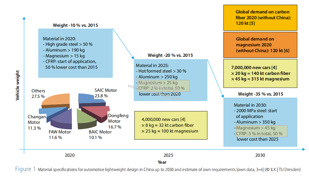 【汽车轻量化在线】随着全球人口不断增加,对交通出行的需求也在增加。为了尽可能地保护环境,汽车轻量化设计变得至关重要,原材料需求量的迅速增加及国家政策的限制都影响着区域范围内原材料的可用性,稀缺原材料的可用性对轻量化设计方法产生了重要影响。 前言 在未来30年内,世界人口预计将增长20亿。同时,人们将迁往城市,这意味着到2050年,城市人口将从21增至63亿。在未来的城市中,交通出行将越来越集中在公共交通解决方案上,而在城市以外地区的支线交通将在很大程度上保持个性化。对于乘用车市场,这将导致多样性的增加,需要严格的成本控制,并且需要重新考虑平台和出行方法。尽管近年来为改善环境影响而采取的措施做出了重大贡献,但仍不足以实现长期气候目标,表1。 动力总成技术的每种形式都需要其自身的乘用车系统结构框架。来自不同制造商的动力总成系统将产生竞争。无论车辆是由内燃机、电动力系统还是由燃料电池动力。将内燃机驱动的车辆重量减少100kg将使燃料消耗降低0.4l / 100km。对于使用电池驱动的车辆,最多可节省5%的电能,从而相应地提高了续航里程。 稀缺汽车原材料的处理 在未来,考虑到不同的动力系统类型的同时,工程师们将比现在更专注于为每一个车辆系统寻找一种更为优化的轻量化设计方法。区域范围内的全球原材料供应将在强制采用轻量化设计的工业方法中发挥更大的作用。预测的不同汽车原材的轻量化潜力如表2所示。 图1为2030年中国汽车轻量化设计的材料分类和自身需求估计,图中展示了如何将轻质材料(例如碳纤维和镁)视为具有战略重要性、以及适当的长期专用资源 中国的钢铁、铝和镁等产品组合目前正在扩大,其中也包括碳纤维。因为中国对碳纤维的需求将远远超过2030年的全球供应量,因此从制造业的角度来看,可能会对全球市场价格产生不利影响。考虑到2025年国内需求总量为30到62kt,2030年仅汽车行业需求总量超过140kt,自有碳纤维的增长曲线需要与钢和铝的增长曲线相似。虽然这些数字中尚未包括其他仍属新兴市场,但这些市场将通过其在全球的竞争地位,大大提高汽车市场的供应量,见表3。 出于国家利益而行使轻量化设计所需的原料未来出口限制可能会对全球生产地区造成不利影响。因此,轻量化设计师需要将这些考虑到轻量化设计的一部分,并确保在最终产品中尽量少使用该稀缺的轻量化材料。多材料系统作为一种解决方案,只会产生相对于单个部件的成本而言较低的生产成本。典型的B柱示例说明了这一点,该B柱不仅重量减轻,需要组装的零件少、成本低,而且还具有显著的防撞性能优势(图2和图3)。 结论 因此,为应对未来汽车市场轻量化材料需求的快速增长,除了相应轻量化原材料的可用性外,汽车轻量化设计师还需要深入了解掌握如何使用仿生方法将质量最小化、基于负载路径进行多材料设计、针对生产和运营中的能源消耗进行成本评估以及作为开发中系统整体元素的经济回收。 作者:PROF. HUBERT JÄGER;PROF. MAIK GUDE;汽车轻量化在线翻译整理;原创文章未经许可不得转载 |