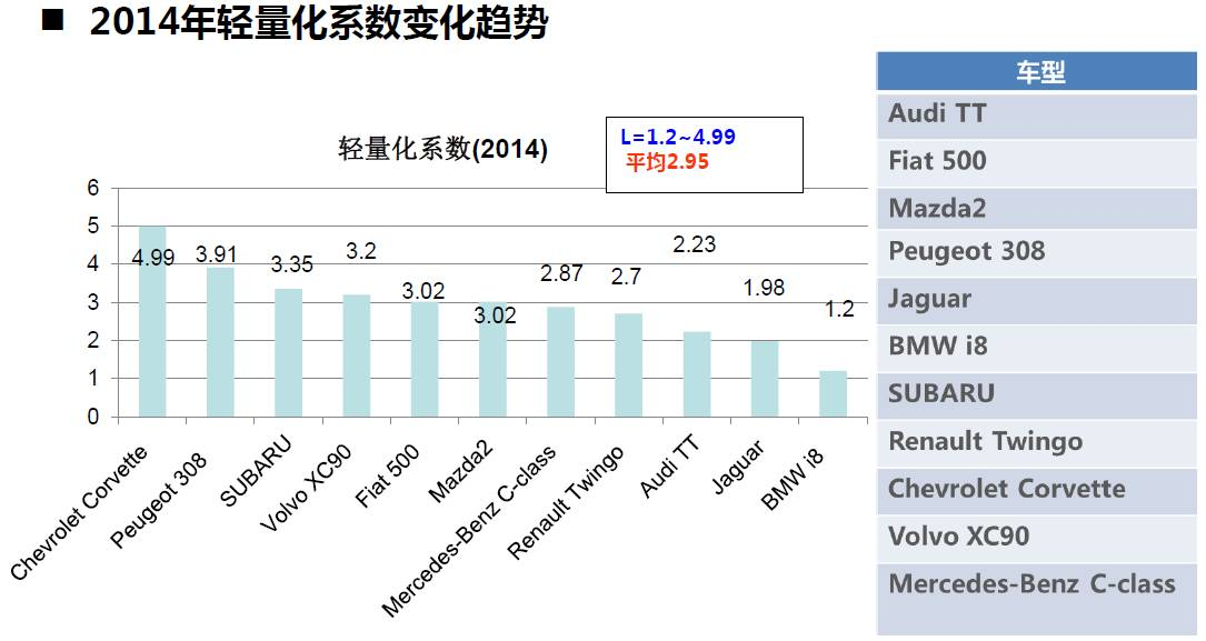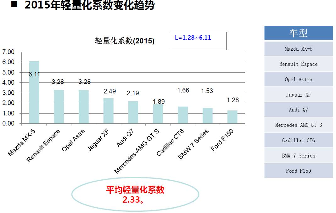 ECB参比的机构组成 我们先来看看2011~2015年这五年ECB获奖车型的名单及其轻量化系数。在这份榜单数据里,我们可以很直观的看到,平均轻量化系数与最小轻量化系数是呈现下降趋势,这与目前的行业发展趋势很吻合,驱动动力主要来源于两方面,一是各国家和地区政府对能耗和排放的政策越来越严格,新能源和轻量化设计成为必要手段,二是汽车车身设计水平在提升,厂家对于成本的管控做的更精细化。