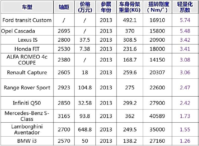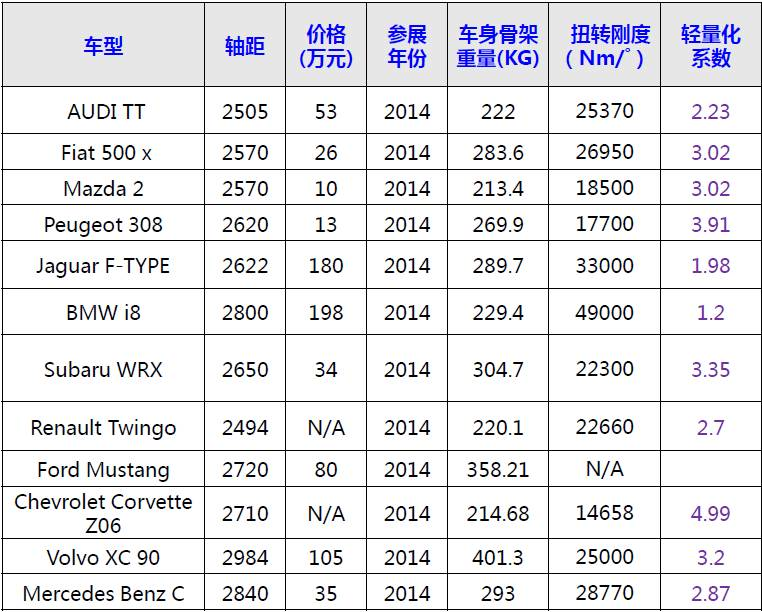 2015年ECB获奖车型以及其轻量化系数 在这份统计中,我们还能发现:从2013年开始,随着CRFP和铝合金在一些车体上应用比例的提升,轻量化的最低系数开始突破了2,而且逐年有递减趋势。其次是小微型车轻量化系数都普遍偏高,比如MX-5的轻量化系数高达6.11。这里主要是受限于两方面的原因:其一是受限于制造成本(i3和TT这类豪华品牌成本敏感度不高的车型除外),新材料使用较少;其二是因为短轴距的小型车对扭转刚度的性能要求不高,导致轻量化系数的分母偏小。最后是中高端品牌车型轻量化设计要好于普通品牌车型,同时德系同级别车型轻量化设计要好于其他国家和地区车型。 轻量化系数平均值说明的只是一个行业趋势,而如果要对比具体车型,就需要考虑到车型车身扭转刚度性能以及车型的轮距和轴距。我们再来看看2011~2015这五年ECB获奖车型的性能参数,然后依据轴距对车型进行分级做一个平均值的对比计算。我们将这些车型分为四个级别:轴距2600以下级别,轴距2600~2700级别,轴距2700~2900级别,轴距2900以上级别。同时剔除掉一个最高值、一个最低值,以及超级跑车等影响性能平均值失真的因素。 轴距2600以下有10款车(Alfa 4C和MX-5属于k-car,不计入统计范围,同时剔除掉Golf Cabriolet和BMW i3),平均白车身重量238kg,扭转刚度21813.3Nm,轻量化平均系数3.27; 轴距2600~2700(包含2700)有17款车(剔除Avebtador和F-TYPE这两款超跑对扭转性能评估所引起的失真、同时剔除Opel Cascada和AMG GT S),平均白车身重量280.8kg,扭转刚度21931.4Nm,轻量化平均系数3.17; 轴距2700~2900有12款车(Mustang未公布扭转刚度值,再剔除掉BMW i8和Corvette Z06),平均白车身重量307.3kg,扭转刚度23680.6Nm,轻量化平均系数3.19; 轴距2900以上有10款车(F150作为pickup不计入样本,再剔除XC90和BMW 7系),平均白车身重量313.4kg,扭转刚度29813Nm,轻量化平均系数2.19。