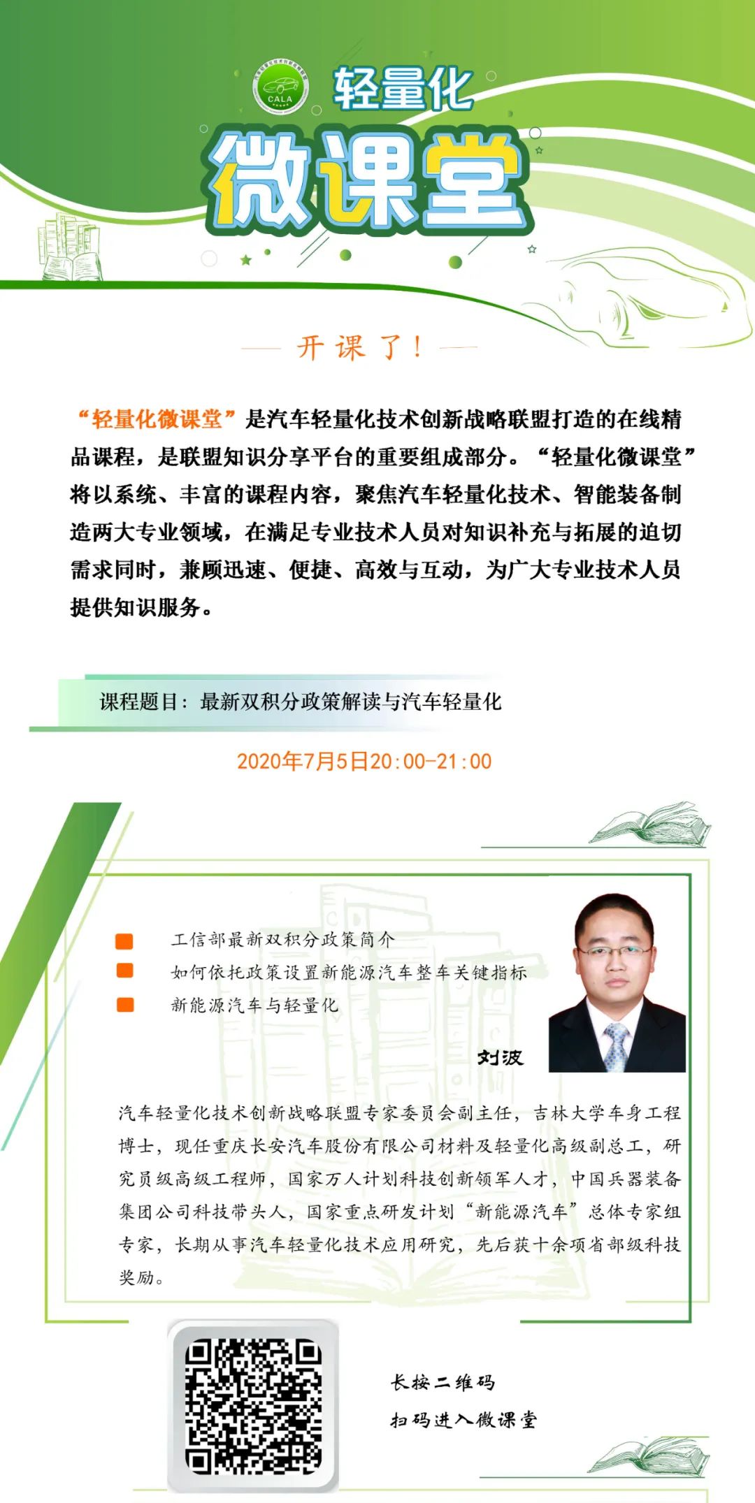 【汽车轻量化在线】轻量化微课堂开课啦!长安汽车刘波-最新双积分政策解读与汽车轻量化关于汽车轻量化技术创新战略联盟 汽车轻量化技术创新战略联盟(简称“轻量化联盟”)是国内汽车行业第一个跨产业、跨学科的产业技术创新战略联盟,致力于在汽车企业与科研机构、高等学校之间、上下游产业之间建立有效运行的产学研合作创新机制,实现联盟单位的共同发展。 |