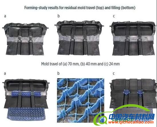 在对后地板模块的设计、可加工性和性能等所有主要方面作了大量的模拟工作之后,通过对大型和小型部件的测试,验证了这些模拟,比如,通过几种不同的成型研究,可以看看模具行程(上)和填充(下)带来的影响(图片来自弗劳恩霍夫化学技术研究所)