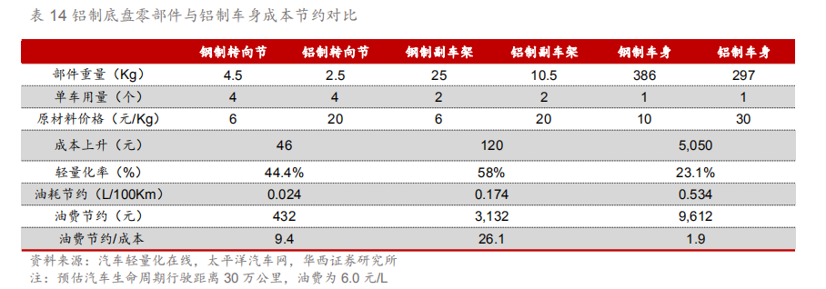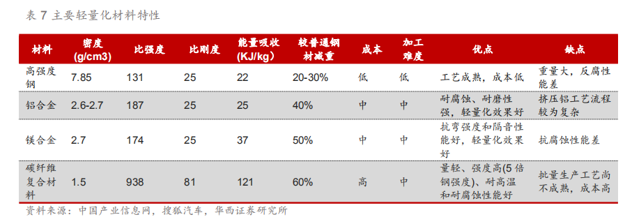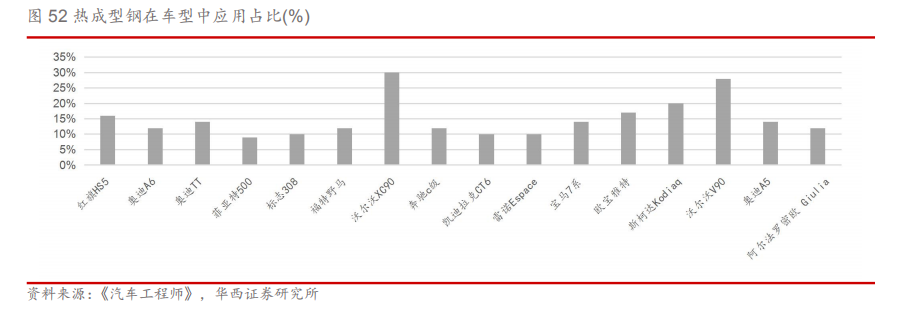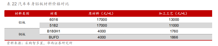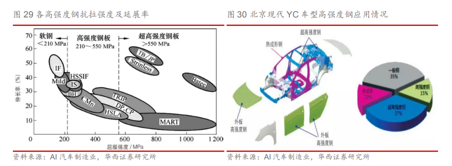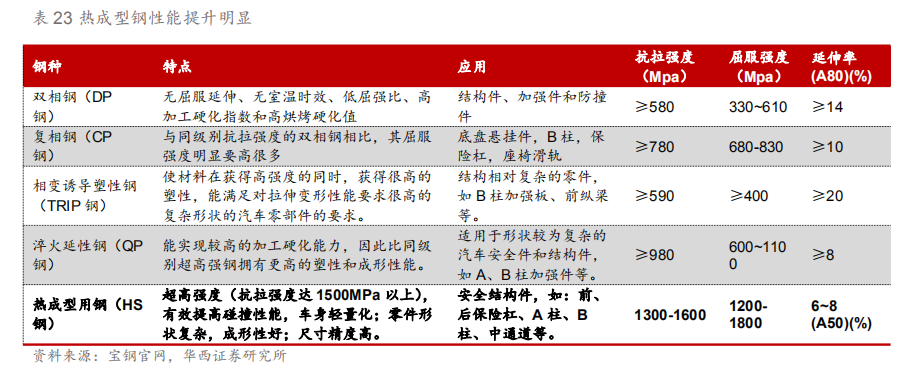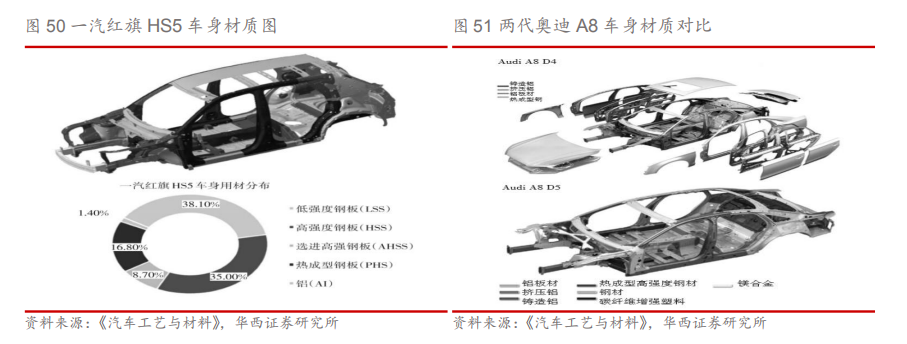 3.2.车身轻量化:热成型高强度钢为核心 鉴于性能与成本双重考虑,车身以钢材为主。白车身作为整车占比最高的部分(25%-40%),通过使用轻量化材料(如铝合金)可降低车身40%-60%重量,由于发动机、变速箱等机械部件受限于强度、设计、结构等方面存在较大的轻量化难度,车身作为驾驶舱的安全壁垒,其轻量化更受青睐。由于钢材在屈服强度、拉伸强度、延伸率等性能上都较其他轻量化有着明显安全性能优势,因此钢材在车身上的使用面积更多。 同时成本昂贵也成了限制车身使用大量轻量化材料的重要原因,铝合金的原材料价格为钢材的3-4倍,由于铝制车身各零部件之间的连接工艺目前并不成熟,成品率低,专业设备配置要求高,加工工艺的成本较已形成成熟体系的钢材贵10倍左右,使得当前铝制车身尚未得到广泛的普及。