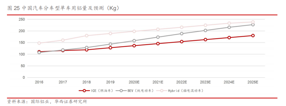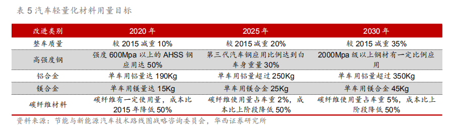 1.5.单车用量提升 汽车轻量化加速 单车用量递增,轻量化进程加速。根据节能与新能源汽车技术路线图战略咨询委员会的轻量化目标,在2020/2025/2030年要分别较2015年减重10%/20%/35%,提升高强度钢应用占比,增加铝合金、镁合金、碳纤维材料单车用量以及降低材料的成本。根据国际铝业协会统计显示,2019年中国燃油车、纯电动车、插电混动车的单车用铝量分别为128/143/189Kg。鉴于新能源汽车对轻量化的需求更为迫切,国际铝业协会预计到2025年新能源汽车的单车用铝量将会达到227Kg,同期的传统燃油车及插电混动车的单车用铝量为180/238Kg。