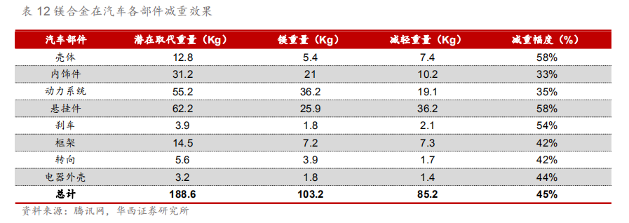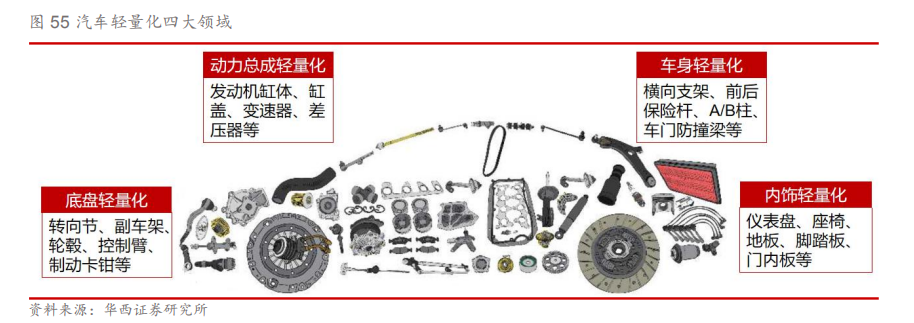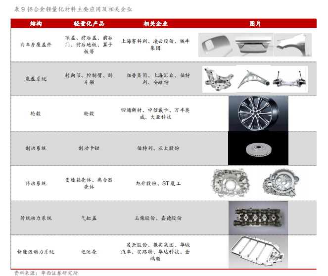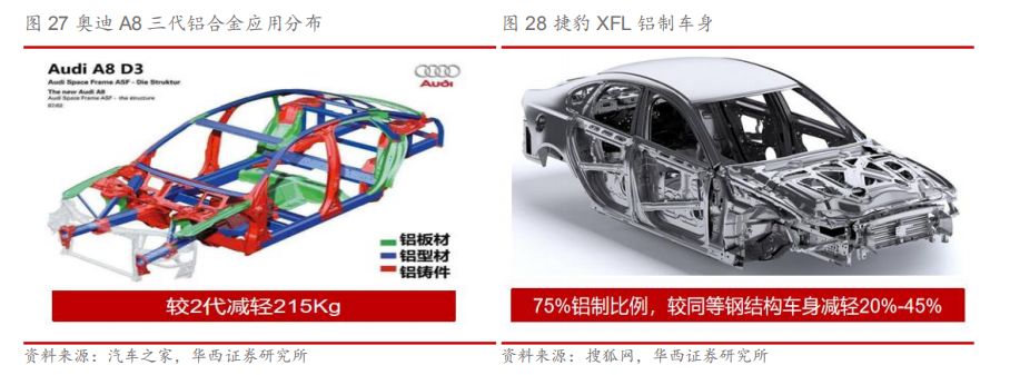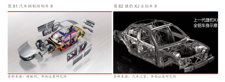 铝合金可广泛应用于车身各系统,显著减少车身重量。铝合金对于车身整体减重具有显著效果,因此可广泛应用于白车身覆盖件,如顶盖、前后门、翼子板等。汽车的动力系统、传统系统、制动系统、底盘及轮毂等也占据车体的主要重量,因此也是铝合金轻量化应用的主要发展方向,采用铝合金车身的捷豹XF比上一代车型减重190kg,减重效果为10%。新能源汽车方面,动力电池系统是新增系统且重量较大,对于轻量化需求更加迫切,因此铝合金电池外壳也是新能源汽车轻量化的全新增量。