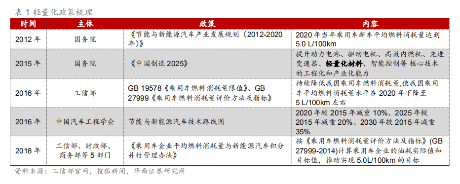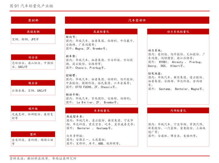 【汽车轻量化在线】在节能减排政策与电动化加速的驱动下,汽车轻量化正在加速。本篇深度报告从电动化加速发展下的视角洞察产业,解析驱动因素、实现途径、应用领域等要素的变化与趋势,汽车轻量化主要通过采用轻量化材料搭配特定的轻量化工艺来实现,其中铝合金和热成型高强度钢为主流,底盘轻量化为新蓝海,铝电池盒为全新增量。本报告全方位剖析汽车轻量化产业,试图为产业发展趋势画像,并提供未来的投资主线。 政策+电动化驱动 汽车轻量化加速 汽车的轻量化是指在保持汽车的强度和安全性能不降低的前提下尽可能地降低汽车车身质量。1)节能减排政策推动:传统汽车整车重量每降低10%,油耗降低6%-8%。我国在2020年和2025年燃料消耗目标值分别为5L/100km和4L/100km,2019实际值为5.7L/100km,距离目标值仍有差距,政策要求下使得主机厂加速轻量化布局。2)电动化加速驱动:新能源汽车对轻量化需求更为迫切,纯电动汽车整车重量每降低10kg,续航里程可增加2.5km。IEA 数据显示,2019年全球新能源汽车(BEV和PHEV,下同)渗透率为2.6%,其中中国为4.9%,预计2025年有望提升至16%/25%。对应销量表现,2019年全球新能源汽车销量210.2万辆,其中中国新能源汽车销量为106.0万辆,预计2025年有望提升至1400/600万辆。特斯拉和蔚来汽车轻量化引领行业,在材料、工艺和结构轻量化上形成自身独有技术优势,比亚迪、北汽新能源、吉利汽车等传统车企亦纷纷加码轻量化布局。因此,在节能减排压力和新能源汽车性能提升需求的双重推动下,汽车轻量化正在加速。国际铝业协会统计2019年燃油与新能源汽车单车用铝分别为128/143KG,预计2025年达179/226KG。 材料轻量化大趋势 铝合金和热成型高强度钢为主流 目前实现轻量化可以通过三种途径:1)轻量化材料,如使用结构更轻的高强度钢、铝合金、镁合金、碳纤维复合材料对传统普通钢结构进行代替;2)轻量化设计,如通过开发全新的汽车架构实现轻量化,甚至优化车身零部件数量、减少零部件尺寸等;3)轻量化工艺,如热成型、激光拼焊板等工艺。实务中轻量化主要通过采用轻量化材料搭配特定的轻量化工艺来实现减重效果。目前最主流的轻量化材料为高强度钢和铝合金材料,预计2020年高强度钢和铝合金将占据汽车轻量化市场的85%以上,其中铝合金占比近65%,随着镁和碳纤维等渗透率提升,预计2025年高强度钢和铝合金占比将降至75%,其中铝合金占比为60%。 底盘轻量化新蓝海 铝电池盒为全新增量 汽车轻量化主要有四个领域:车身轻量化、底盘轻量化、动力系统轻量化与内外饰件轻量化。从性价比来看,由于簧下质量(悬挂以下的控制臂、卡钳、轮毂等)减重性价比远高于簧上质量(悬挂以上的车身结构件等),有着“簧下1公斤,簧上10公斤”的说法。2019年国内高强度钢及铝合金底盘市场规模分别为139/138亿元,随着材料成本逐渐降低,工艺制造技术升级,预计2025年将分别提升至349/398亿元。其中2019年铝合金转向节、副车架、控制臂、制动钳渗透率分别为28%/10%/19%/6%,预计2025年渗透率有望达到60%/25%/40%/20%,对应规模为78/196/104/21亿元。新能源汽车轻量化发展速度更快,2019年国内新能源汽车底盘轻量化市场规模为46亿元,随着新能源汽车销量增长叠加轻量化渗透率提升,预计2025年有望提升至320亿元,CAGR达38%,其中铝电池盒、副车架市场规模分别为180/75亿元,CAGR分别为31%/55%。 投资建议 在节能减排政策与电动化加速的驱动下,汽车轻量化正在加速,其中底盘轻量化为新蓝海,铝制电池盒、副车架、控制臂、转向节等渗透率不断提升,同时热成型车身件也开始大规模应用,国产替代加速进行,我们建议重点关注底盘轻量化集大成者、铝电池盒供应商、热成型车身件先发者及精密铝件隐形冠军。 报告正文 1.政策+电动化驱动 汽车轻量化加速 政策+电动化驱动,汽车轻量化加速。汽车的轻量化是指在保持汽车的强度和安全性能不降低的前提下尽可能地降低汽车车身质量。1)节能减排政策推动:传统汽车整车重量每降低10%,油耗降低6%-8%。我国在2020年和2025年燃料消耗目标值分别为5L/100km和4L/100km,2019实际值为5.7L/100km,距离目标值仍有差距,政策要求下使得主机厂逐渐接受轻量化带来的成本上涨,渗透率进一步提高。2)电动化加速驱动:新能源汽车对轻量化需求更为迫切,纯电动汽车整车重量每降低10kg,续航里程可增加2.5km。因此,在节能减排压力和新能源汽车性能提升需求的双重推动下,汽车轻量化正在加速。 产业助力,轻量化技术为汽车行业的重要发展方向。《中国制造2025》中在汽车发展的整体规划上强调了“轻量化仍然是重中之重”;2016年,中国汽车工程学会节能与新能源汽车技术路线图发布会中,指出汽车轻量化技术将成为汽车行业未来重点发展目标之一,其中要在2025年,力争整车质量平均减轻20%,汽车钢铁比例占汽车总重的30%,单车用铝合金达到250kg,单车用镁量达到25kg,碳纤维使用量占车辆比重的2%,对汽车轻量化提出了具体目标。