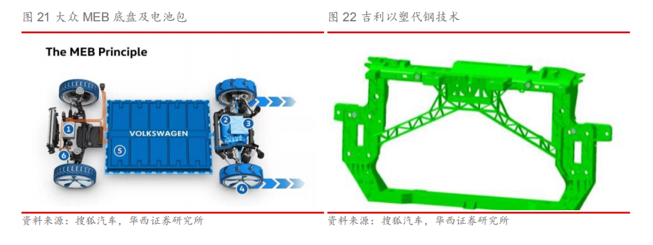 1.4.3.其他车企加速布局轻量化 传统车企加码轻量化。进年来,除了新能源汽车造车新势力,传统车企也逐步进入新能源汽车赛道。同时凭借本身在造车方面的技术积累和资金优势,传统车企在新能源汽车轻量化方面也有着亮眼的表现。 1)大众:大众在其全新的新能源汽车平台MEB中使用全新的车身布局,将电池与电机融入车身低架,采取平板式电池模组放置于车轴两侧,同时采用铝合金材质作为电池壳保护电池,减少电池包重量推动轻量化。 2)吉利:作为国内重要的整车厂商,吉利也十分重视轻量化。使用以塑代钢技术,采用薄壁化保险杠,采用高性能材料,在保证保险杠刚性的条件下,将前后保险杠壁厚降到2.5mm,实现单车减重约1kg。