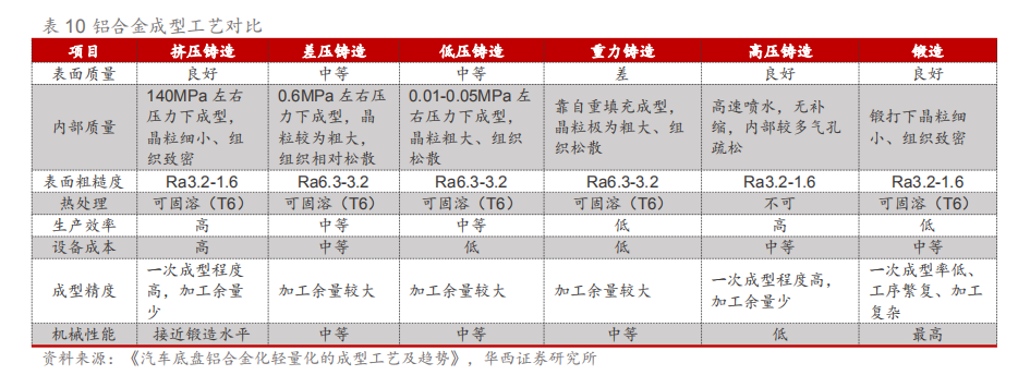 铝合金成型工艺各有千秋,美日经验显示挤压铸造或为未来方向。铸造工艺方面,由于内部质量疏松的问题,铸铝压铸件不易由高压压铸生产,一般为低压/差压压铸或者挤压压铸工艺。但对比美国、日本,我国关于间接挤压铸造的研究起步较晚,在量产方面还有很多不足,导致挤压铸造产品质量稳定性差、废品率高等诸多问题;锻造工艺方面,由于其能消除金属在冶炼过程中产生的铸态疏松等缺陷,优化微观组织结构,同时其适应性广、原材料来源广的特点有助于为铝合金成型提供更多解决方案。