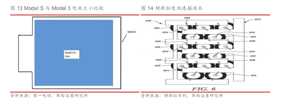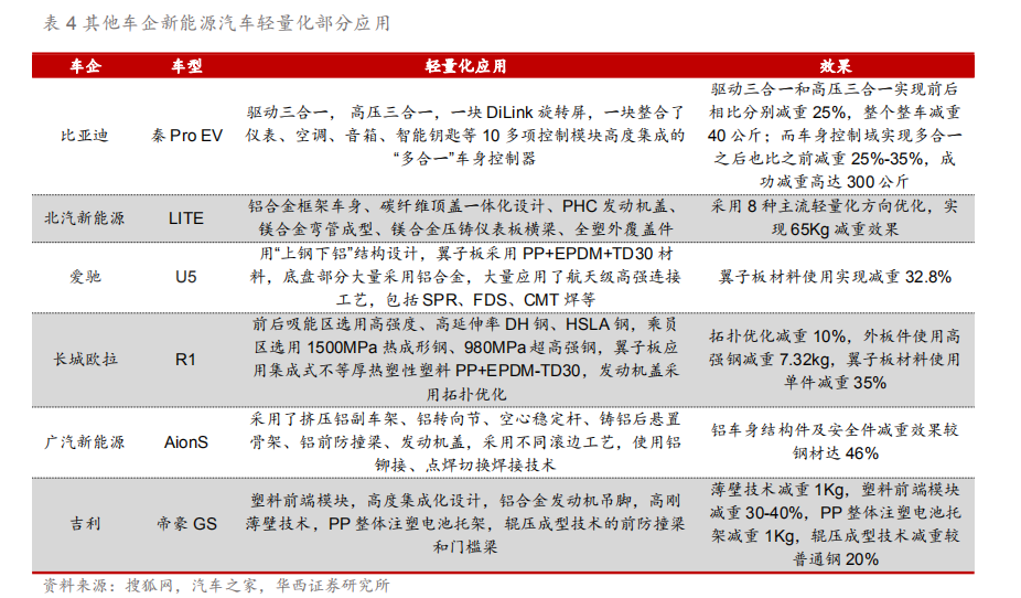 1.4.造车新势力引领 传统车企跟进 1.4.1.特斯拉轻量化布局特斯拉引领新能源汽车轻量化。 作为新能源汽车领域领军企业,特斯拉在新能源汽车的轻量化方面持续加码,拥有极为深厚的技术基础,在多方面对其旗下车型进行轻量化。1 )电池密度:特斯拉电池能量密度的提升赋予了Model 3更长的续航能力,且应用单个容量更大的2170电池还可降低电池数量的使用数量,从Model S的7000多节降低到Model 3的4416节,电池节数的下降使特斯拉质量进一步减重。 2)电池连接工艺:特斯拉电池模组里的电池连接方式比起传统的电阻焊有着质的改变,与Model S相比,Model 3上将正负极连接片从一整片铝片连接变成了布局在电池组两侧,将两面铝片结合成了单面铝片,减少铝片使用量,降低电池重量。