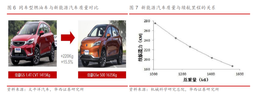 新能源汽车对轻量化的需求更为迫切: 由于智能网联化的配置要求,新能源汽车搭载三电系统和大量智能化设备,相对传统汽车增重比较大,国创中心研究认为,我国新能源汽车轻量化严重落后,对标国外同类产品,我国电动乘用车普遍偏重10%-30%,电动商用车普遍偏重10%-15%。 纯电动汽车整车重量每降低10kg,续航里程可增加2.5km。 轻量化技术的应用有利于减少制动距离,增加动能节省,亦有利于减轻噪音振动性。 由于消费者对于续航里程及充电时间的敏感,轻量化对于新能源汽车尤为重要,随着未来新能源汽车不断普及,充电设施陆续覆盖,节能环保需求提高,新能源汽车轻量化市场空间非常广阔。