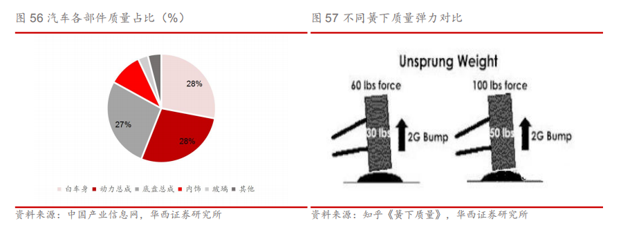 3.1.底盘轻量化:汽车轻量化的新蓝海 底盘承载占比高,簧下轻量化为关键。汽车底盘作用在于支撑、安装汽车发动机及其各部件、总成,成形汽车的整体造型,作为汽车三大部件之一,在汽车整车占比达27%,位列汽车部件质量排名第三。汽车底盘承载着近70%的汽车总重量,对于汽车行驶性而言,簧下质量每减轻1Kg,带来的效果等效于簧上质量减轻5-10Kg,特别在汽车加速性能、稳定性能及操控性能等方面尤为明显。