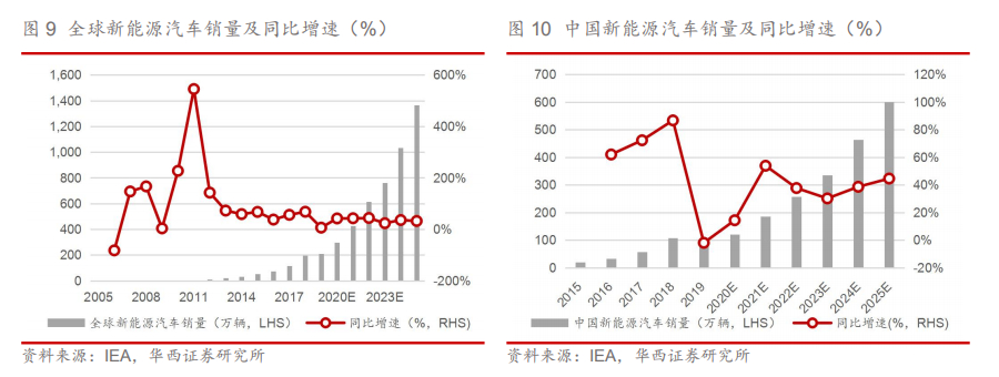 质变撬动需求,新能源汽车渗透率有望迎来加速提升。新能源汽车产业正处于从政策驱动向供给端驱动转变的关键时刻:政策端国家补贴延长两年至2022年,同时2020版“双积分”政策落地明确最新积分要求,长效激励机制逐步完善;供给端爆款车型密集上市成为核心驱动力,类比智能手机发展史,爆款车型的出现将推动行业从导入期迈入成长期,从2.0时代迈入3.0时代。新能源汽车渗透率有望加速提升根据IEA数据,2019年全球新能源汽车(BEV和PHEV,下同)渗透率为2.6%,其中中国新能源汽车渗透率为4.9%,预计2025年有望提升至16%/25%。对应销量表现,2019年全球新能源汽车销量210.2万辆,其中中国新能源汽车销量为106.0万辆,预计2025年有望提升至1400/600万辆。
