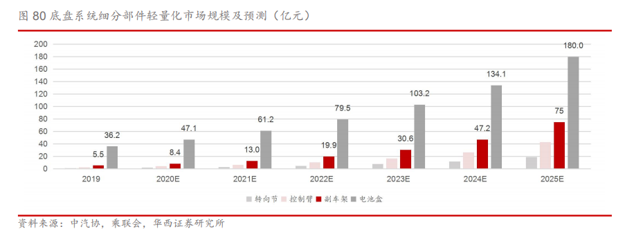 电池盒贡献量多,副车架成长性高。新能源汽车较传统汽车在底盘上多装配了电池盒,电池盒与底盘系统结合作为汽车底部的承载部分。由于国内汽车铝制电池盒单车配套价值量为3000 元以上,国外价格单车配套价值更高,电池盒对底盘轻量化市场规模贡献最大;铝制副车架单车价值在2500-3000元左右,目前渗透率较低,市场规模成长性高。考虑新能源汽车高速增长带动汽车轻量化需求提升,在市场需求和政策导向双重刺激下,预计2025年国内新能源汽车铝电池盒、副车架市场规模分别为180/75亿元,CAGR分别为31%/55%。