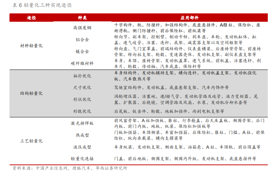 2.材料轻量化大趋势 铝合金和高强度钢为主流 轻量化主要通过轻量化材料搭配特定工艺实现。目前,实现轻量化可以通过三种途径:1)轻量化材料。如使用结构更轻的高强度钢、铝合金、镁合金、碳纤维复合材料对传统普通钢结构进行代替。2)轻量化设计。如通过开发全新的汽车架构实现轻量化、甚至优化车身零部件数量、减少零部件尺寸等。3)轻量化工艺。如热成型,激光拼焊板等工艺,实务中轻量化主要通过采用轻量化材料搭配特定的轻量化工艺来实现减重效果。
