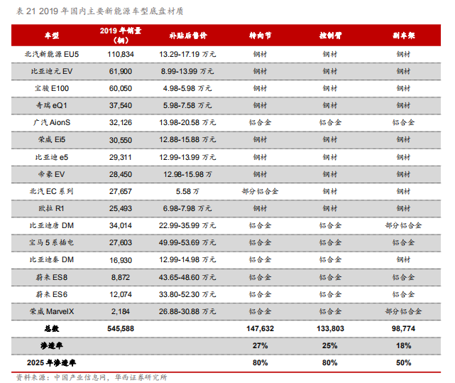 底盘材料轻量化,渗透率增长空间大。2019年国内主力新能源车型均开始采用轻量化底盘方案。以广汽AionS、上汽MarvelX为主的纯电动车型目前均大量采用轻量化底盘结构,转向节、控制臂、副车架均使用铝合金材料,其他相对经济型的车型目前采用部分铝合金的部件。据测算,2019年转向节、控制臂、副车架轻量化渗透率分别为27%/25%/18%,未来随着轻量化材料成本下降、制造工艺逐步升级,轻量化底盘零部件将加速渗透,预计2025年转向节、控制臂、副车将铝合金渗透率可达80%/80%/50%,渗透率增长空间大。