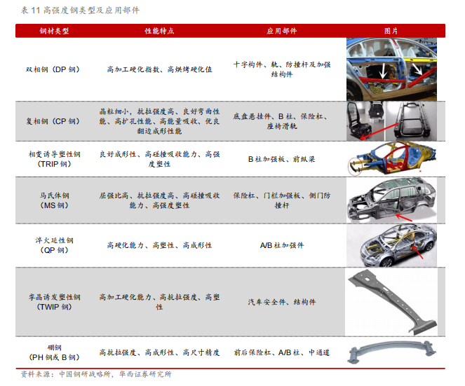 抗拉屈伸性能高——高强度钢。国际上将抗拉强度210-550MPa的钢板划分为高强度钢,大于550MPa为超高强度钢。国际钢铁协会组织设立的“先进汽车概念”项目使得以高强钢(HSS)和超高强钢(UHSS)为主要材料的汽车白车体减重25%。高强度钢有着较高的结构强度、优越的碰撞吸能性和抗疲劳强度,且冲压成形性、焊接性和可涂装性均表现优良,车身上高强度钢多用于白车身上的结构件、安全件上。