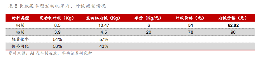 2.1.1.铝合金和高强度钢最具性价比 减重降本成效高——铝合金。铝合金的密度低、质量轻、可加工性强,能够根据特定需求加工成不同的形状尺寸,叠加其拥有价格优势,是目前实现整车轻量化的首选材料,主要运用于前后防撞梁、水箱框架、机器盖、翼子板、前后悬挂的摆臂、副车架等。 1)从性能角度看,铝的密度约为钢的 1/3,汽车使用1 kg铝可替代自重2.25 kg的钢材,且铝合金结构设计优化可以实现二次减重,整体减重效果大于50%,此外铝合金具有强度高、可循环、耐腐蚀、密度低等优点。 2)从成本的角度看,铝合金价格仅为钢的2.5倍,远低于碳纤维复合材料,镁合金的价格和铝合金相近,但镁合金的易腐蚀问题限制了其在汽车行业的大规模应用,因此铝合金是现阶段最佳的轻量化材料。 根据长城汽车发动机内、外板的轻量化数据,铝制发动机内、外板较钢制发动机内、外板分别轻6/4.5Kg,轻量化率(减重质量/原件质量)达到57%/54%,但价格同比仅为43%/53%,价格增幅要低于轻量化效率。随着铝制零部件制作工艺提升,逐步形成量产型生产线,制造成本下降,未来汽车各部件铝制化将加速渗透,市场规模持续扩大。
