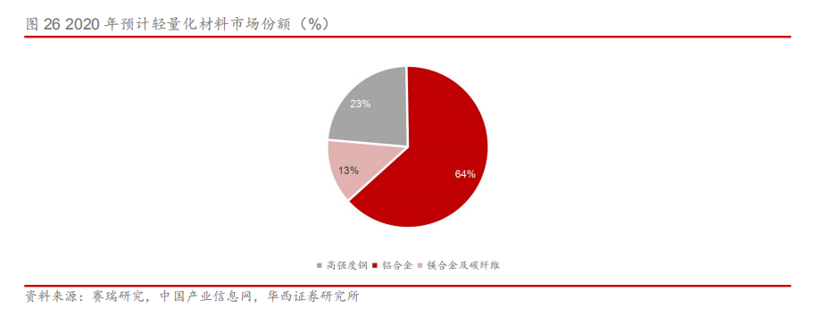 2.1.材料轻量化:高强度钢和铝合金性价比高 目前汽车行业轻量化材料主要有:高强度钢、铝合金、镁合金、碳纤维复合材料,对应减重效果及成本费用上由低到高。 高强度钢和铝合金性价比高,占据轻量化市场较大份额。市场上最主流的轻量化材料为高强度钢和铝合金材料,高强度钢由于其超高强度主要应用于车身骨架的关键部位;铝合金材料由于其良好的减重效果主要应用于覆盖件,壳体等位置。两者的性能和价格可达到平衡,因此了实现大规模商业化应用。根据赛瑞研究和中国产业信息网数据,预计2020年高强度钢和铝合金占据了汽车轻量化市场的85%以上,其中铝合金的比例接近65%。 镁合金和碳纤维材料目前缺陷显著,限制其大规模商用。镁合金耐腐蚀性差、易燃、成本较高的缺陷限制了其应用,因此镁合金一般应用于内饰,轮毂和动力总成中。碳纤维复合材料成本远超镁铝合金,但减重效果远胜于金属材料,目前仅应用于赛车、超级跑车等。若碳纤维成本能够下降到合理水平,将有望得到更加普遍的应用。