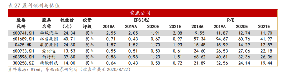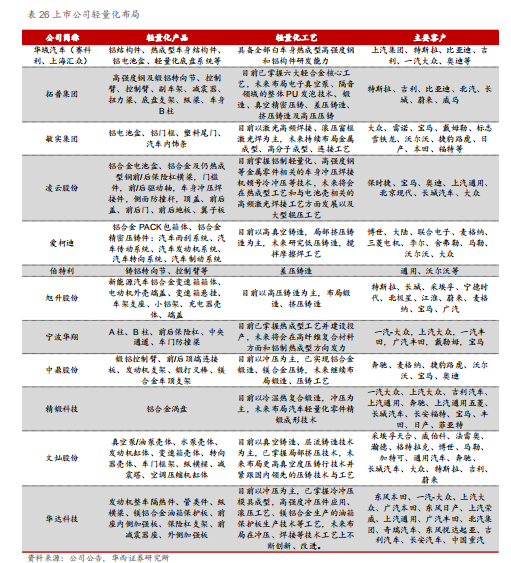 4.总结及投资建议 政策+电动化驱动,汽车轻量化加速。汽车的轻量化是指在保持汽车的强度和安全性能不降低的前提下尽可能地降低汽车车身质量。1)节能减排政策推动:传统汽车整车重量每降低10%,油耗降低6%-8%。我国在2020年和2025年燃料消耗目标值分别为5L/100km和4L/100km,2019实际值为5.7L/100km,距离目标值仍有差距,政策要求下使得主机厂加速轻量化布局。2)电动化加速驱动:新能源汽车对轻量化需求更为迫切,纯电动汽车整车重量每降低10kg,续航里程可增加2.5km。IEA 数据显示,2019年全球新能源汽车(BEV和PHEV,下同)渗透率为2.6%,其中中国为4.9%,预计2025年有望提升至16%/25%。对应销量表现,2019年全球新能源汽车销量210.2万辆,其中中国新能源汽车销量为106.0万辆,预计2025年有望提升至1400/600万辆。特斯拉和蔚来汽车轻量化引领行业,在材料、工艺和结构轻量化上形成自身独有技术优势,比亚迪、北汽新能源、吉利汽车等传统车企亦纷纷加码轻量化布局。因此在节能减排压力和新能源汽车性能提升需求的双重推动下,汽车轻量化正在加速。国际铝业协会统计2019年燃油与新能源汽车单车用铝分别为128/143KG,预计到2025年达179/226KG。 轻量化主要通过轻量化材料搭配特定工艺实现,铝合金和热成型高强度钢为主流。目前实现轻量化可以通过三种途径:1)轻量化材料,如使用结构更轻的高强度钢、铝合金、镁合金、碳纤维复合材料对传统普通钢结构进行代替;2)轻量化设计,如通过开发全新的汽车架构实现轻量化、甚至优化车身零部件数量、减少零部件尺寸等;3)轻量化工艺,如热成型、激光拼焊板等工艺。实务中轻量化主要通过采用轻量化材料搭配特定的轻量化工艺来实现减重效果。市场上最主流的轻量化材料为高强度钢和铝合金材料,预计2020年高强度钢和铝合金占据了汽车轻量化市场的85%以上,其中铝合金的比例接近65%。 底盘轻量化是汽车轻量化新蓝海,铝电池盒为全新增量。汽车轻量化主要有四个领域:车身轻量化、底盘轻量化、动力系统轻量化与内外饰件轻量化。从性价比来看,由于簧下质量(悬挂以下的控制臂、卡钳、轮毂等)减重性价比远高于簧上质量(悬挂以上的车身结构件等),有着“簧下1公斤,簧上10公斤”的说法。2019年国内高强度钢及铝合金底盘市场规模分别为139/138亿元,随着材料成本逐渐降低,工艺制造技术升级,预计2025年将分别提升至349/398亿元。其中2019年铝合金转向节、副车架、控制臂、制动钳渗透率分别为28%/10%/19%/6%,预计2025年渗透率有望达到60%/25%/40%/20%,对应规模为78/196/104/21亿元。新能源汽车轻量化发展速度更快,2019年国内新能源汽车底盘轻量化市场规模为46亿元,随着新能源汽车销量增长叠加轻量化渗透率提升,预计2025年有望提升至320亿元,CAGR达38%,其中铝电池盒、副车架市场规模分别为180/75亿元,CAGR分别为31%/55%。 在节能减排政策与电动化加速的驱动下,汽车轻量化正在加速,其中底盘轻量化为新蓝海,铝制电池盒、副车架、控制臂、转向节等渗透率不断提升,同时热成型车身件也开始大规模应用,国产替代加速进行,建议关注底盘轻量化集大成者、铝电池盒供应商、热成型车身件先发者及精密铝件隐形冠军。 相关受益标的: 1) 底盘轻量化集大成者:华域汽车、拓普集团、伯特利等; 2) 铝电池盒供应商:敏实集团、凌云股份等; 3) 热车型车身件先发者:宁波华翔、凌云股份等; 4) 铝压铸小件隐形冠军:爱柯迪、旭升股份等。