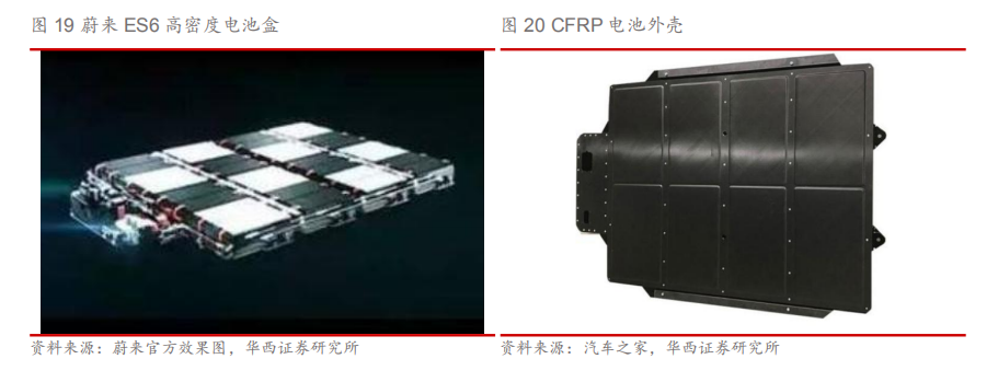 3)高密度电池:蔚来ES6电池类型是三元锂电池,供应商是宁德时代,ES6车型都可以选装容量更大的84kwh液冷恒温电池组(ES8电池组为70kwh),单体电芯能量密度为170wh/kg,NEDC综合工况下的续航里程超过了510公里 。较大的电池容量有效的减少了电池包本身带来的重量。 4)轻量化电池壳:德国西格里碳素公司已与中国汽车制造商蔚来达成合作,将为蔚来研发碳纤维增强型塑料(CFRP)电池外壳原型,该电池外壳比传统的铝或钢制电池外壳轻40%,具有高刚性,而且比铝的热导率低200倍。采用该材料的电池包后不仅可为蔚来旗下电动车型减轻一定的重量,还会给换电带来便利。