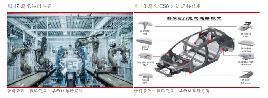 5)车身结构:特斯拉采用了不同的车身设计,Model 3取消了空气室下板,由塑料件代替下板流水,减重效果达40%;车门无窗框设计相比于冲压窗框减重65%;车门内板、前后车门内板不等料厚设计,优化车门下沉,可实现减重效果。 6)先进工艺使用:特斯拉不同部分的零件使用了不同的先进工艺,在碰撞吸能的位置(如前纵梁、A柱、B柱、后纵梁等)采用热冲压钢板工艺,提高了强度且减轻了重量。Model 3 在侧碰吸能的位置如车地板横梁采用超高强度钢辊压成型工艺,比冲压件减重17%以上。 1.4.2.蔚来汽车轻量化布局 蔚来汽车为国内新能源汽车轻量化风向标。蔚来汽车作为国内的新能源汽车明星品牌,加注轻量化,在新能源汽车轻量化领域也取得了一定的成效。 1)铝制车身:蔚来ES8车身运用了诺贝丽斯(Novelis)先进的汽车铝合金,全铝车身比传统钢制车身降低了约40%的重量,最终实现白车身重量仅为335kg。ES8还采用了麦格纳所为其设计、制造的全铝前/后副车架;同时蔚来ES8在底盘和悬挂系统全部采用铝合金材质,车身用铝率达到95.8%,为全球最高。 2)先进连接技术:为了应对铝合金材质本身延展性差、形变难以恢复等特点,蔚来采用多种先进连接技术。包括热融自攻铆接、自冲铆接、铝点焊、冷金属过渡弧焊、结构胶、激光焊接、高强度抽芯拉等先进连接技术。