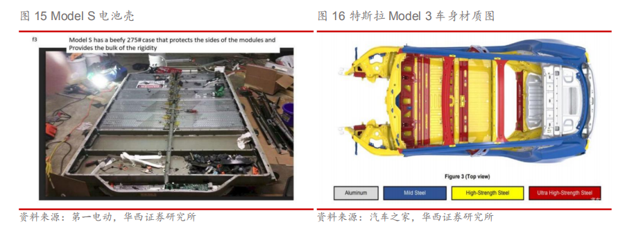 3)电池包结构:减少模组使用,相较于Model S车型(电池包分为16个小模组),Model 3长续航版的电池包则只有4个模组,更少的模组意味着更少的电池包内部隔断、电池组BMS、线束和散热管路接口;电池壳结构变迁,与Model S专门设置电池壳保护电池不同,Model 3的电池组安装位置基本覆盖了乘员舱,利用车身底部高强度钢结构同保护电池,电池包结构组件只用于承载电池包自身重量,相较Model S电池包减重125KG。 4)轻量化材料:目前铝合金和高强度钢仍然是轻量化材料的首选。车身支架上,特斯拉Model S采用了全铝合金车身有效的降低了车身重量,Model 3由于考虑到自身定位与成本控制更多采用了高强度钢。2019国产Model 3采用钢铝混合车身,铝材占比下降至21%,超高强钢占比上升至15%;在高压导线上,特斯拉使用高压铝导线,较相同载流量的铜导线相比减重21%,且成本更低。