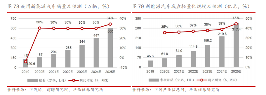 新能源汽车轻量化底盘规模可达300亿元以上。中汽协数据显示,2019年我国新能源汽车销量为120.6万辆,同比减少4%,主要受新能源政策退坡及2018年高基数影响。根据三部委印发的《汽车产业中长期发展规划》,要求我国2025年新能源汽车销量占总销量20%以上,预计2025年我国新能源汽车销量将达到600万辆,CAGR达31%。2019年我国新能源汽车底盘轻量化市场规模为45.6亿元,随着新能源汽车产销持续增长,轻量化材料逐步渗透,预计2025年新能源汽车底盘轻量化市场规模达约320亿元,CAGR达38%。