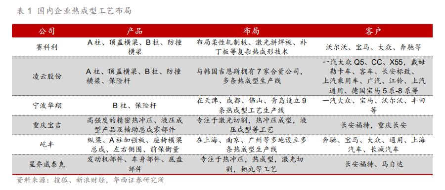 热成型产业的国产替代已逐步实现。早期国内的热成型产品主要由本特勒、海斯坦普等巨头垄断,中国的第一条热成型生产线于2005年由本特勒长瑞汽车系统长春有限公司建成。目前全世界共有400条以上的热冲压生产线,中国地区已有100余条,国内主要的热成型企业有凌云股份、东风天汽模、宁波华翔、重庆宝吉、屹丰集团等。国内企业已经基本实现外资与自主抗衡的局面,国产替代进行时。