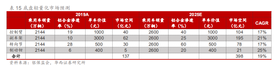 底盘轻量化市场空间有望大幅增加。我们预计铝制控制臂、副车架、转向节、制动钳轻量化产品渗透率将大幅提升,带动市场份额的大幅增加,2019-2025年CAGR分别为17%、21%、17%、25%。整体底盘轻量化市场有望从2019年的137亿元增长至20 25年的398亿元,实现CAGR为19%的高增长。