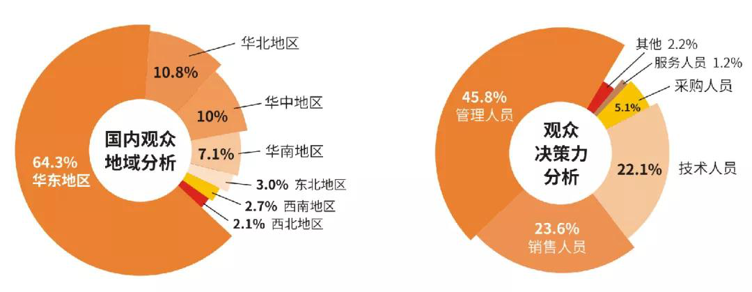 上届展会 观众数据分析 展期三天共迎来专业观众25,793人,主要来自上海、江苏、浙江、山东、广东、河南、河北、湖南、北京等30个省(直辖市、自治区)的330个县市。受新冠肺炎疫情影响,来自港澳台地区及国外的观众仅数十人,主要是国际公司的中国分部、代理企业或合资公司的驻华代表。 出乎众人意料的是,在这个疫情肆虐的特殊年份,上届展会观众数量不减反增,较2019年增长了14%,体现市场正在借助展会释放积蓄已久的采购需求。