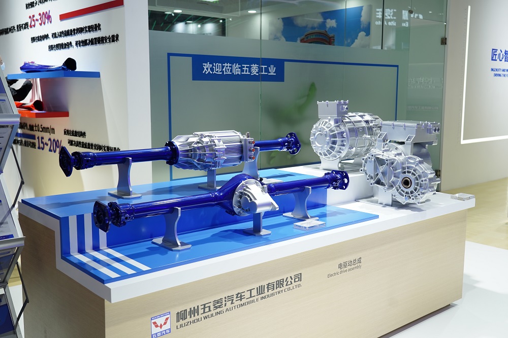 【汽车轻量化在线】2021年4月19日,第十九届上海国际汽车工业展览会开幕,柳州五菱汽车工业有限公司(简称“五菱工业”)首次亮相。此次展览会,五菱工业带来了底盘系统、动力系统、车身系统等最新产品和技术,并正式发布“菱擎”前置后驱混合动力系统。 五菱工业带来多款参展产品:例如铝合金电动桥和铝合金发动机,相对传统铸铁零件,采用铝合金轻量化设计产品重量显著减轻;采用热气胀和液压成形两种工艺生产的轴梁产品,该产品在现有车型上已有应用,轻量化效果明显,可广泛应用于底盘。 五菱工业在新产品新产线上投入了巨大的精力,先进的工艺技术为轻量化产品更新提供基础,强大的工艺制造装备确保产品可靠性及各项性能,此次展览彰显了五菱工业的深耕功力。 (一) 底盘系统 底盘系统参展展品包括燃油桥(后桥制动总成、独立主减速器总成)、电动桥(同轴式电动桥总成、偏轴式电动桥总成、同轴式电驱动总成、三合一电驱动总成等)。 1)底盘轻量化展品介绍 · 偏轴式电动桥总成 该产品采用轻量化设计,减速器壳体使用压铸铝合金材料,桥壳使用结构轻巧的三段式焊接结构,主减总成重量仅7.4Kg,后桥总成重量仅27Kg,相对传统铸铁零件,重量减轻了30%。通过优化结构设计,主减总成较同类型主减速器零件种类减少22%,零件数量减少了47%,提高了装配效率,降低了制造成本,目前该产品搭载在宏光miniEV车上。主减速器扭