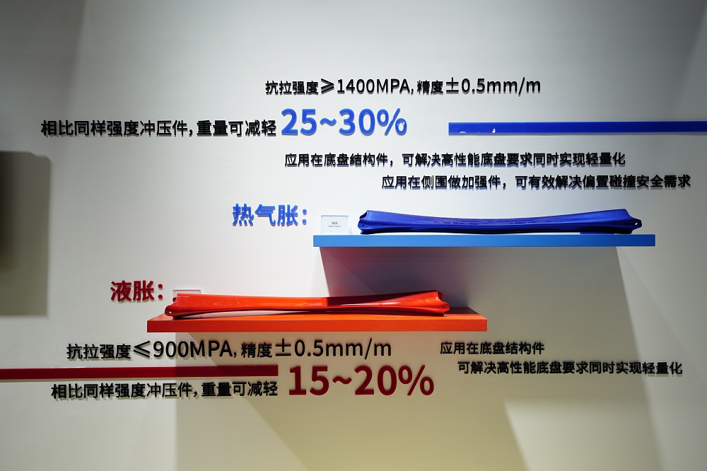 (三) 车身系统 车身方面的参展产品包括热气胀和液压成形两种工艺生产的轴梁产品。 1)车身轻量化展品介绍 ·轴梁(热气胀) 轻量化效果可减轻约30%。此产品可应用于底盘零部件(副车架纵管梁、横梁、扭力梁等)、白车身零件(A柱、B柱、防撞梁等)侧围加强框、电池包零件横梁。 轴梁产品通过HMGF&Q技术(结合超高压气体循环控制技术、模内环向强冷技术、分区热控制技术),实现模内淬火,形成针状马氏体化,获得产品抗拉强度≥1400MPa。同时,模内保压,使得产品轴线整体回弹小于0.5mm/m。该产品不仅在汽车轻量化上迈出了重要一步,也有效解决了偏置碰撞安全需求。 ·横梁(液胀) 轻量化效果可减轻15%-20%。广泛应用于底盘前后副车架管件、控制臂、保险杠、排气歧管等。通过充液成形工艺,目前制件一般仅能达到抗拉900Mpa以下。若需达到热气胀同等强度的管件,需增加线下淬火工艺,但管件淬火后出现热应力释放,变形不可控,无法达到热气胀管件精度效果。