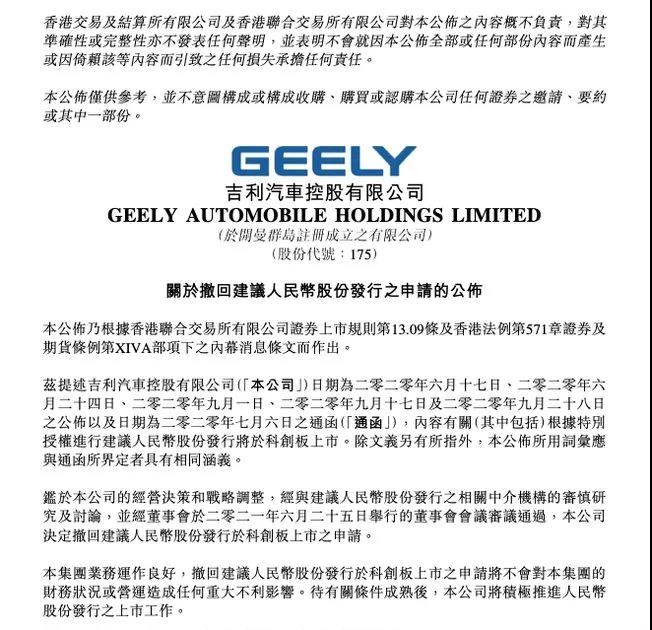 【汽车碳中和】6月25日,吉利汽车(0175.HK)在港交所公告称,因公司经营决策和战略调整,经公司董事会于2021年6月25日审议通过,决定撤回首次公开发行股票并在科创板上市的申请。 同时,吉利汽车当天还公告称表示,旗下极氪智能科技控股有限公司(以下简称“极氪智能科技”)董事会已决议为极氪智能科技可持续发展探索不同的外部融资方案。 吉利汽车终止科创板IPO 6月25日,吉利汽车(0175.HK)发布公告,鉴于公司经营决策和战略调整,经与建议人民币股份发行之相关中介机构的审慎研究及讨论,并经董事会于2021年6月25日举行的董事会会议审议通过,决定撤回建议人民币股份发行于科创板上市之申请。 吉利汽车表示,集团业务运作良好,撤回建议人民币股份发行于科创板上市之申请将不会对集团的财务状况或营运造成任何重大不利影响。待有关条件成熟后,本公司将积极推进人民币股份发行之上市工作。 回顾吉利汽车登陆科创版之路,2020年6月17日,吉利汽车发布公告称,董事会批准可能发行人民币股份及于上海交易所科创板上市的初步建议,有分析认为这意味着已在香港上市的吉利将回归A股。 2020年9月1日,吉利汽车向上交所科创板提交了上市申请。吉利汽车在此前的招股书中表示,公司将主动迎接行业变革新趋势,继续秉承以创新引领发展的基本方针,通过与全球领先企业交流、协作和分享,占领技术制高点,打造未来汽车出行新业态,逐步实现从汽车制造商向汽车出行科技企业转型的战略目标。 同时,公司实际控制人控制的下属企业中包括曹操专车及耀出行、太力飞行汽车、 亿咖通科技、时空道宇、碳循环等智慧立体出行业务单元,在共享出行、飞行汽车、车联网/车载芯片/操作系统、卫星通讯、锂电池梯次利用、充换电基础设施、碳循环制 醇等创新商业模式及前沿技术方面均有布局。 吉利汽车表示,上述主要企业围绕出行领域的变革趋势,在商业模式创新及技术研发方面均有较多探索和积累,对于公司未来的产品技术发展及 商业模式变革优化均将有良好的协同和推动作用。 公司计划募资超过200亿元,主要用于新车型产品研发项目、前瞻技术研发项目、产业并购等。 实际上,今年的3月就开始有消息称吉利汽车因为“高科技定位”问题,在科创板上市遇到阻碍。今年3月,吉利控股副总裁杨学良曾针对此回应称:“没有进一步消息可提供,根据上市进程信息披露规范,一切以监管层批复为准。”随后的5月,市场上开始流传吉利汽车回归科创板被终止了。但吉利官方对此没有进一步的回应。 极氪智能另谋出路 同日,吉利汽车还发布公告称,旗下合资公司极氪智能科技控股有限公司董事会已决议为极氪智能科技可持续发展探索不同的外部融资方案。 当天上午,吉利控股集团与宁波市北仑区人民政府签署极氪智能电动汽车项目投资合作协议,双方将在全力打造中国汽车产业标杆、推动科技创新应用化、加快制造服务全链化、提升交通出行绿色化等方面形成战略协同,同时,极氪汽车全球总部落户宁波。此外,吉利正式启动吉利共同富裕计划,宣布将积极探索实践吉利共同富裕示范区先行点,助力构建更加完善的宁波汽车产业生态体系,带动全产业链可持续发展,实现产业共富。 今年3月23日,极氪汽车正式宣布成立,由吉利汽车、吉利控股集团(含员工跟投平台和用户权益平台)共同投资,其中吉利汽车持股51%,吉利控股集团持股49%。李书福出任极氪汽车董事长,安聪慧出任极氪汽车CEO。 作为吉利汽车集团今年推出的全新高端电动车品牌,极氪汽车首款车型ZEEKR 001已经上市销售,6月15日,极氪汽车宣布,因产能受限, ZEEKR 001即日起暂停接收意向金。目前,ZEEKR 001 2021年可交付定单已经全部售罄,该车将于今年10月开始交付。 极氪成立之初就表示有在海外寻求融资的需要。比如吉利控股集团CEO李东辉就曾公开表示,极氪未来将寻求海外上市,目前的股权设计也为引入战略投资者保持了灵活性。资料显示,极氪公司的注册地在英属开曼群岛。 极氪的“翻车事件” 不过冰冻三尺非一日之寒,用户对极氪的不满,也不是一事促成。而是在其开始预定至今的时间里,极氪官方一点一点在突破用户的底线,直至如今车主彻底爆发。 6月15日,极氪官方宣布,因2021年可交付产能已售罄。即日起,停止接收意向金。此时,有车主发现在极氪微信订车小程序上显示极氪001 WE版价格由原来的26.6万元,变成了28.4万元。对此,极氪官方表示,涨价是因为不确定2022年国家补贴政策(不确定就能涨价,这个理由有点牵强)。而这也意味着在6月15日到7月31日大定的车主,得多花费5400元的购车费。因为极氪001的补贴为18000元减少30%,既12600元,减少了5400元,这5400也将由用户来承担。然而早前官方给出的信息是7月31号(含)前该价格不会变动。 |
