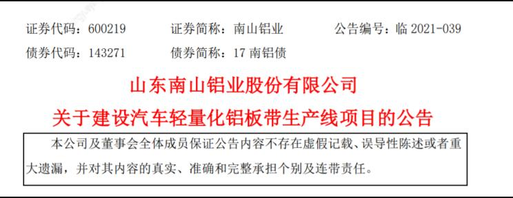 【汽车轻量化在线】7月22日,南山铝业发布公告称,公司审议通过了《关于建设汽车轻量化铝板带生产线项目的议案》,拟投资建设汽车轻量化铝板生产线项目,项目总投资约为20亿元,其中设备费用12.4亿元,工程建设及其他费用7.6亿元,项目所需资金全部由企业自筹。项目建设期预计为18-30个月,项目建成后,每年将新增汽车轻量化铝板带产能20万吨。