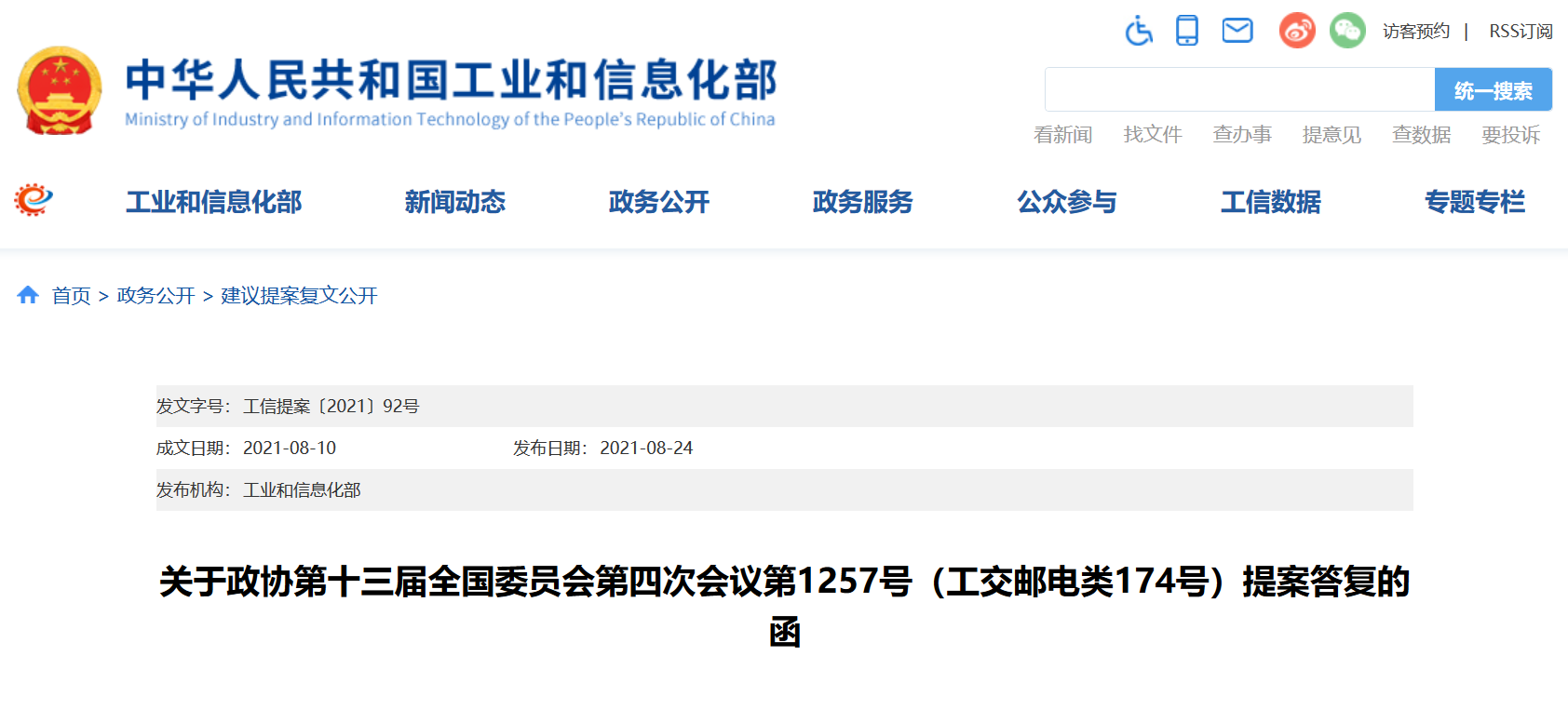 关于政协第十三届全国委员会第四次会议第1257号(工交邮电类174号)提案答复的函