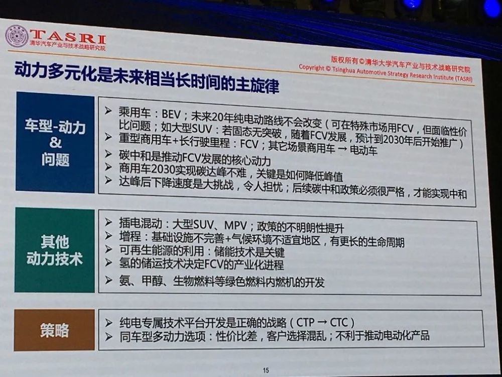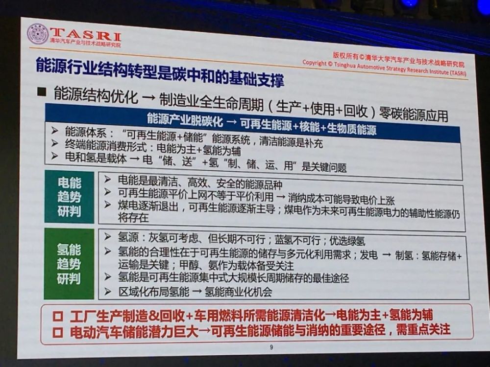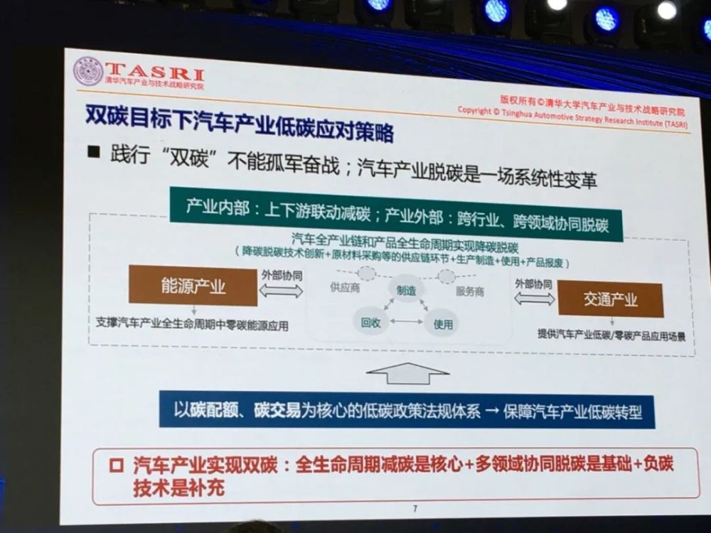 【汽车碳中和】当前,汽车产业的发展进入到一个百年未有的产业重构新时代。汽车已经从“沙发+4个轮子”升级到“一台移动的电脑”“一个移动的储存装置”。汽车“新四化”的发展趋势以及碳达峰、碳中和的宏伟目标为汽车产业的发展提供了新的机遇和新的挑战,同时也为产业发展注入了新的动能。 日前,由中国人才研究会汽车人才专业委员会、在日华人汽车工程师协会、全球汽车精英组织牵头策划并举办的2021第八届全球华人汽车精英联合年会暨“中国拥抱世界”汽车产业创新论坛在上海成功举办。与会嘉宾分享了当前汽车产业关注的话题,现整理刊发,以飨业内。 《碳中和与中国汽车应对之路》——清华大学汽车与技术战略研究院院长赵福全 “践行‘双碳’不能孤军奋战,汽车产业脱碳是一场系统性变革,动力多元化是未来相当长时间的主旋律。” “万物互联”和“碳中和”正在改变着人类社会。与以往改变人类社会原动力、驱动力不一样的是:“万物互联”和“碳中和”超越了技术,是全方位系统性的,涉及到社会的方方面面,并且与汽车工业息息相关。 碳中和是中国必走的路。碳中和要告别人类赖以生存的碳基能源,对世界的改变也是不言而喻的。但是因为能源无处不在,任何一个在人类社会生存的生命体都需要能源,所以这是一个立体的、系统性、全球性的问题,需要全人类共同解决。 碳中和一方面考虑的是生态环境也就是人类生存问题,更要解决人类经济发展的问题,所以它解决的是生产生活的问题,而其中,生产则依赖能源。因为改变所有各个国家的工业能力、技术能力、生产生活方式,所以它是未来各个国家经济、政治博弈的绝对核心要点。从这一角度来看,其政治价值远大于万物互联,它是重塑所有国家在世界的经济地位。 双碳政策下,我国汽车工业面临的挑战有三个方面: 第一,规模大,关注度高。汽车产业是集大成的产业。中国交通业还在发展当中,中国还有三倍的空间。产业要发展,就面临着碳排放的压力。汽车产业链非常长,汽车减碳具有代表性的意义。 第二,国际经贸机制与市场竞争环境变化。 第三,汽车要做到双碳目标需上下游的配合。汽车碳排放规模大,被关注度高,可视性强。 那么汽车工业如何做到控碳呢?基本上全球围绕制造业都是一样的,首先是解决上游能源问题;二是解决本领域的减碳问题,最终解决下游客户问题。对于汽车工业而言,要解决全产业链、全生命周期的问题,从产品制造到最后报废的全生命周期,所有的供应链都要减碳,而这不仅是制造、生产、物流,还要考虑到使用环节的减碳。 上游是能源,要倒逼能源产业减碳,同时还要给交通环境提出减碳。什么样的交通环境让汽车更加低碳,就涉及到交通中用的各类车型,以及自动驾驶在城市里要达到的比例等等。这是一个系统工程。 先看上游能源产业。未来告别化石燃料,就意味着与天然气、石油、煤说再见。这时就要依靠可再生能源,核能,生物基燃料。目前来看,生物质燃料要解决碳基燃料的问题是不可能的;核能有安全问题,同时还有对水资源的依赖,要大规模发展也比较难。所以德国在欧洲能源危机的时候把核电站去除了,就是有这样深层次的思考。 那么就只有可再生能源了。可再生能源方面,中国已经基本把水力应用的差不多了,剩下就是太阳能和风能。太阳能和风能最大的问题是间歇性和不稳定性。发电的时候效果非常好,太阳不“露脸“、不”起风“,就没有电。 我国制定了可再生能源的发展规划,这是基于碳达峰制定的指标。如果说能源产业不转型,制造业要做到低碳基本是不大可能。因为制造过程中都要使用能源,如果能源都是用碳的,那低碳是不现实的。可再生能源是重要组成部分,而可再生能源最重要的是储能问题。因此储能才是最难的技术攻关难点,也是最大的投资热点。目前储能产业化最多的是蓄水和蓄热。 未来,围绕可再生能源是电和氢。能用电的都用电,用不了电的地方只能用氢。所以电动化是大势所趋。电能清洁方便成本低,但是如何输送和存储成为考量的重点;氢则有如何制造和存储的问题。所以这两个方面决定了未来所有投资方向、产业发展技术方向。 我个人认为,只要解决电的问题,电动车不需要1000公里续航里程,这也是一种巨大的能耗和浪费,而且在制造电池过程中也会造成大量的碳排放。500公里续航里程的电动车比传统内燃机制造过程中造成的碳排放高70%。对于电动车来说,制造过程中的碳排放,500公里续航里程的碳排放基本上是传统内燃机的一倍左右。 充电解决之后,所有电动车的问题就解决了。另外电动车会成为将来储能最重要的核心方式,那个时候就不是为了电动车本身了,因为可再生能源发电之后如何存储,电池将会起到巨大作用。如果说一台车按照50度电算,500万辆车就可以做到一个三峡的发电量,当中国有1亿辆保有量的时候,中国电动车保有量按照一台车平均50度电,可以做到20个三峡。未来,国家已经把电动车储能作为可再生能源储能最重要的方式。 电动车储能真的那么容易吗?首先,储能是要白天放电,晚上充电。这对电池有巨大的挑战。一方面是电池循环寿命的问题,另一方面电池不仅要能充电还要能放电。另外,充电桩也是只能放电不能充电,而电网是只能送电不能收电,中国电网的灵活性只