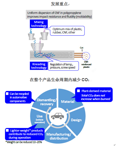 【汽车碳中和】近日,丰田合成公司(Toyoda Gosei Co., Ltd.)开发了一种纤维素纳米纤维(CNF)增强塑料,旨在减少汽车零部件从原材料采购和生产到回收利用的整个生命周期中的CO2和处置。 在向脱碳和循环经济迈进的过程中,丰田合成利用CNF的以下特性开发可提高其产品环保性能的材料。 ü 首先,CNF的重量是钢的五分之一,强度是钢的五倍。当用作塑料或橡胶中的增强材料时,产品可以做得更薄,泡沫成型变得更容易。这减轻了重量并有助于降低车辆行驶过程中的 CO2排放量。 ü 其次,当车辆报废后重新使用材料时,加热和熔化后的强度损失很小,这使得汽车零部件的回收成为可能。 ü 第三,是不增加CO2总量的材料。即使CNF被焚化,唯一的CO2排放是植物在生长过程中吸收的物质。 新开发的CNF增强塑料在用于汽车内外饰部件的通用塑料(聚丙烯)中加入了20%的CNF。对于实际应用,包含CNF会降低抗冲击性最初是一个问题。Toyoda Gosei凭借其材料混合设计和捏合技术克服了这一问题,将抗冲击性提高到适合汽车零部件的水平。公司将继续与CNF材料制造商合作降低成本。 该项目是日本环境省(Ministry of the Environment)纳米纤维素促进项目(Environment Nano Cellulose Promotion project)的一部分,该项目旨在促进作为各种产品基础的CNF增强塑料的早期应用,减少CO2。