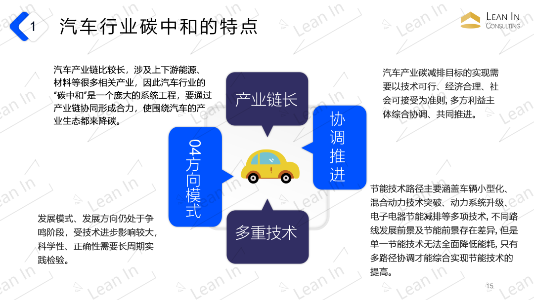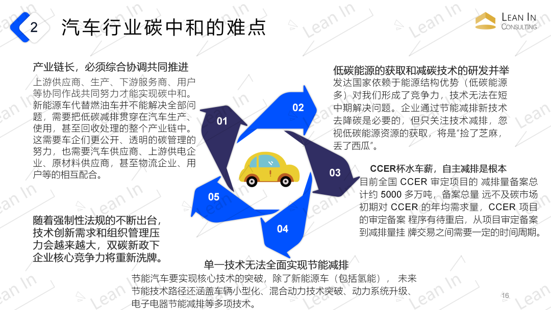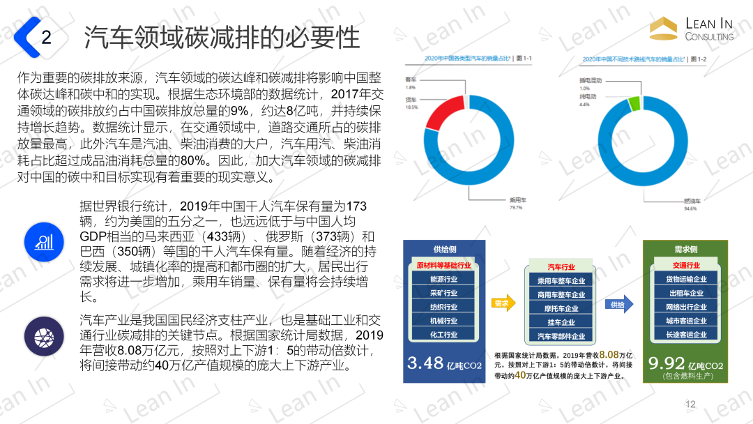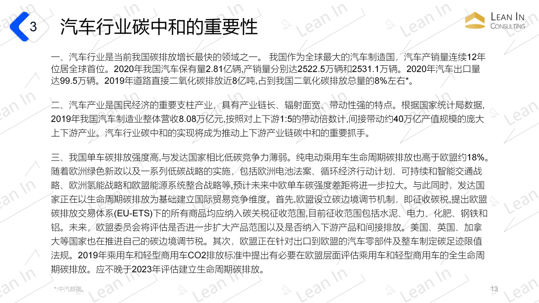 【汽车碳中和】汽车行业碳中和的含义 汽车全生命周期碳排放的净零排放。在产品层面,汽车产品碳中和是指包括车辆周期和燃料周期在内的全生命周期的净零排放。在车队层面,车队碳中和表示某一年份车队保有量中处于不同生命周期阶段所有车辆的碳排放总和的净零排放。 国际车企纷纷提出了各自的碳中和目标,主要涉及了工厂、产品和企业三个层面,实现碳中和的时间点均在2050年之前。例如戴**集团提出“最终在未来20年内建立一支碳中和的新汽车车队”。 未来,随着汽车电动化和智能化的发展,其碳排放也发生了变化,逐步由汽车使用环节向全产业链转移,车辆自身生产制造及上游零部件供应商生产相关的碳排放变得愈加重要。因此汽车行业全生命周期碳中和对推动汽车供应链的碳减排,提高供应链企业的市场竞争力尤为重要。 汽车领域碳减排的必要性 作为重要的碳排放来源,汽车领域的碳达峰和碳减排将影响中国整体碳达峰和碳中和的实现。根据生态环境部的数据统计,2017年交通领域的碳排放约占中国碳排放总量的9%,约达8亿吨,并持续保持增长趋势。数据统计显示,在交通领域中,道路交通所占的碳排放量最高,此外汽车是汽油、柴油消费的大户,汽车用汽、柴油消耗占比超过成品油消耗总量的80%。因此,加大汽车领域的碳减排对中国的碳中和目标实现有着重要的现实意义。 据世界银行统计,2019年中国千人汽车保有量为173辆,约为美国的五分之一,也远远低于与中国人均GDP相当的马来西亚(433辆)、俄罗斯(373辆)和巴西(350辆)等国的千人汽车保有量。随着经济的持续发展、城镇化率的提高和都市圈的扩大,居民出行需求将进一步增加,乘用车销量、保有量将会持续增长。 汽车产业是我国国民经济支柱产业,也是基础工业和交通行业碳减排的关键节点。根据国家统计局数据,2019年营收8.08万亿元,按照对上下游1:5的带动倍数计,将间接带动约40万亿产值规模的庞大上下游产业。 汽车行业碳中和的重要性 汽车行业是当前我国碳排放增长最快的领域之一。 汽车产业是国民经济的重要支柱产业,具有产业链长、辐射面宽、带动性强的特点。 我国单车碳排放强度高,与发达国家相比低碳竞争力薄弱。 汽车行业碳中和的特点和难点 汽车行业碳中和的特点 特点1.产业链长 汽车产业链比较长,涉及上下游能源、材料等很多相关产业,因此汽车行业的“碳中和”是一个庞大的系统工程,要通过产业链协同形成合力,使围绕汽车的产业生态都来降碳。 特点2.涵盖多重技术 节能技术路径主要涵盖车辆小型化、混合动力技术突破、动力系统升级、电子电器节能减排等多项技术, 不同路线发展前景及节能前景存在差异, 但是单一节能技术无法全面降低能耗, 只有多路径协调才能综合实现节能技术的提高。 特点3.方向模式待确定 发展模式、发展方向仍处于争鸣阶段,受技术进步影响较大,科学性、正确性需要长周期实践检验。 特点4.需多方协调推进 汽车产业碳减排目标的实现需要以技术可行、经济合理、社会可接受为准则, 多方利益主体综合协调、共同推进。 汽车行业碳中和的难点 难点1.产业链长,必须综合协调共同推进 上游供应商、生产、下游服务商、用户等协同作战共同努力才能实现碳中和。新能源车代替燃油车并不能解决全部问题,需要把低碳减排贯穿在汽车生产、使用,甚至回收处理的整个产业链中。这需要车企们更公开、透明的碳管理的努力,也需要汽车供应商、上游供电企业、原材料供应商,甚至物流企业、用户等的相互配合。 难点2.低碳能源的获取和减碳技术的研发并举 难点3.CCER杯水车薪,自主减排是根本 目前全国CCER审定项目的减排量备案总计约5000多万吨,备案总量远不及碳市场初期对CCER的年均需求量,CCER项目的审定备案程序有待重启,从项目审定备案到减排量挂牌交易之间需要一定的时间周期。 难点4.单一技术无法全面实现节能减排