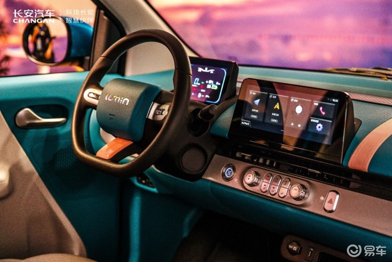 进入车内,新车依旧沿用可爱风设计,横贯中控的饰条两端造型圆润,点缀其中的彩色元素更是让车内多了一份活泼。其中控台材质为硬塑料,与同级别大多数车型一致。7英寸液晶仪表+10.25英寸中控屏UI简洁容易上手,同时全系提供倒车影像、手机互联、语音助手和OTA升级等功能,另外连接手机后还可实现导航、互联网音乐/电台、视频投屏播放等功能。