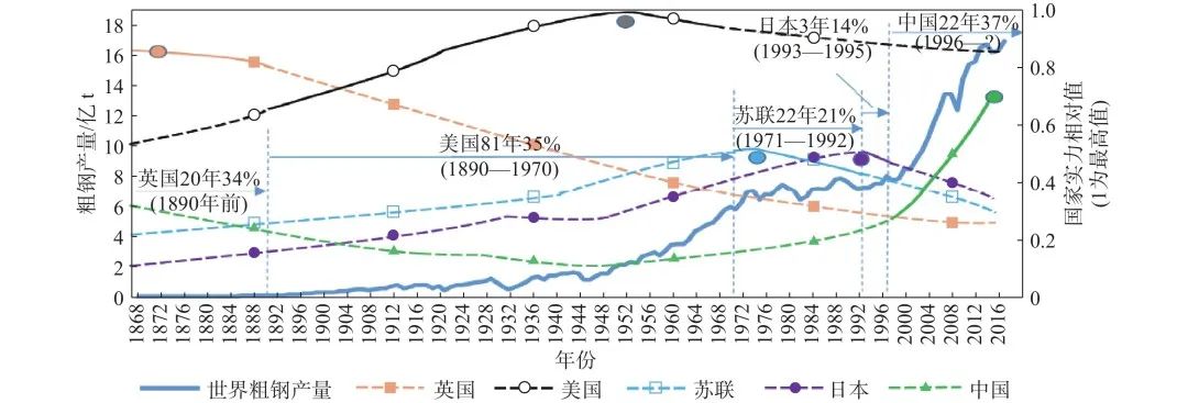被评为新世界7大奇迹的北京首都机场和港珠澳大桥用的钢材可以建造多少座埃菲尔斜塔?人类的世界格局被所谓的夕阳产业左右吗?碳中和背景下钢铁行业如何发展……本文从钢铁与人类文明,钢铁材料的特性,碳中和背景下的钢铁工业几个方面为您话说钢铁。 1 钢铁与人类文明 材料是人类文明、社会进步、科学技术发展的物质基础和技术先导,钢铁材料是人类文明所依赖的重要物质基础,也是影响世界格局的重要因素。社会的文明程度通常用人类社会在不同时期所用的材料来标明,如图1所示。其中的铁器时代和钢铁时代与钢铁材料密切相关。 图1 人类社会文明进程 1.1 铁器时代 铁器的广泛使用带来了社会的巨大变革。春秋末期中国社会开始进入铁器时代,到战国晚期铁器已经开始广泛使用。相较于原来的铜器,铁器的硬度更高,极大的提高了农耕作业的生产效率,促进了社会生产力的大力发展,并导致了社会制度的变革,使部分民族从原始社会发展到奴隶社会,也推动了一些民族脱离了奴隶制的枷锁进入封建社会。可见一种新材料的使用,可以提高生产力,改变生产关系和上层建筑,从而带来社会的变革。 1.2 钢铁时代 钢铁是现代工业革命的基础。18世纪中叶,以蒸汽机为标志的第一次工业革命开始,蒸汽机的使用替代了人力和畜力,从而极大的提高了生产效率,创造了极大的社会财富。但是第一次工业革命除了蒸汽之外实际上还有两个前提:一个是物质的前提,即钢铁的大量使用;第二个是能源的前提,即煤炭的大量使用。因此蒸汽、煤炭、钢铁是促成第一次工业革命加速发展、推动人类新技术革命的三驾马车。使人类进入“电气时代”的第二次工业革命同样离不开钢铁的大量使用,其支柱产业是电力、钢铁、石油和汽车制造。所以说钢铁的大量使用推动了人类由农业经济社会进入工业经济社会。 1.3 钢铁与世界格局 雷德.戴蒙德教授在同时获得普利策奖和英国科普书奖的《枪炮、疾病与钢铁》一书中写道:“现代世纪的不公平起源于使用钢铁武器的帝国能征服或消灭使用石制和木制武器的部落。”(图2)可见钢铁对世界格局和人类社会的发展产生深远的影响。19世纪后叶乃至20世纪中叶,钢产量一直是一个国家的工业水平和综合实力的重要的标志。 图2 雷德.戴蒙德教授和他的《枪炮、疾病与钢铁》 图3中的粗实线是第一次工业革命以来全世界钢产量变化曲线,可以看出这个曲线一直上升,说明开始大量使用钢铁以来,直至今天,钢产量不断上升,同时说明钢铁在我们经济社会发展当中发挥的作用一直在持续,而且不断扩大。1890年之前英国的钢铁产量超过世界总量的1/3,这一时期英国国家实力是最高的,随后美国持续81年钢产量超过英国,成为世界第一,而这一时期同样是美国的国家实力最高时期,苏联和日本也可以得出相同的结论。近些年随着中国改革开放的不断发展,我国成为第二大经济体,我们的钢铁产量开始稳居世界第一,我们的国家实力也同期不断增强,因此说钢铁工业的发达程度和国家的综合国力高度相关。 图3 1868—2016年世界粗钢产量及不同国家的实力水平 图4可以看出新中国成立以来,我国GDP的增长与粗钢产量高度相关,说明一方面我们经济社会的发展离不开钢铁材料的支撑,另一方面年我国粗钢产量已超过全世界产量的一半,我国钢铁产量如此快速增长是受到经济社会发展需求的牵引与拉动。由此可见钢铁材料是经济社会发展的重要物质基础,正如我们伟大领袖毛泽东主席曾经说过:一个粮食,一个钢铁,有了这两个东西什么事情都好办了。 图4 钢铁与经济发展的关系 19世纪中叶以后,除了美国,欧洲国家的钢铁产量也比较多,而日本自1871明治维新运动后,政府积极引进西方先进的科学技术,工业得到飞速发展,钢铁产量也一直位居世界前十。到了二战期间,中国钢产量开始上升,建国后我国国力不断提高,我国的钢铁产量也在不断地跃升,改革开放后我国钢铁产量大幅增加,1993年首次超过1亿t,从1996年开始我们钢铁产量高居世界榜首,到2020年我国的钢铁产量是10.68亿t,大约占全世界钢产量的56%。 1.4 我国钢铁与经济发展 2021年中国的钢产量超过10亿t,用于经济社会的方方面面,我国实现了从弱国向大国的转变。港珠澳大桥主梁用钢量42万t,相当于10个鸟巢,60座埃菲尔铁塔(图5),北京大兴机场钢结构总用钢量7.2万t(图6),汽车的主要材料是钢铁,中国的名片高铁、铁路轨道、车轮和车轴都是钢铁,最重要的是我们大多数产品均实现完全的国产化,例如重轨,船舶,航母、潜艇、大型驱逐舰,海上的一些装备、钻井平台,西气东送所使用的管线钢(图7)等。 图5 港珠澳大桥 图6 北京大兴国际机场 图7 中俄东线——21.4 mm×80 m 板卷 经过不断的技术创新,我们在诸多的领域从过去的跟跑,实现了部分的并跑,还有部分领跑。曾经我们经常谈到,我们这么大一个国家,笔的使用量如此庞大,却一度笔尖钢全部依靠进口,但是通过这几年我们钢铁行业的不断努力,满足了笔尖制作的精度要求,笔尖钢已经完全实现自主供给(图8)。 图8 笔尖钢实物图 以前我们知道有晴雯撕折扇、大街上卖的有手撕饼,现在有一种新的不锈钢片,俗称“手撕钢”,它的厚度只有0.02 mm,是普通A4纸厚度的1/4,可以用来折飞机、如同撕纸一般轻而易举的撕成任何形状,但是其韧性却很大,双手扯住两端用力往