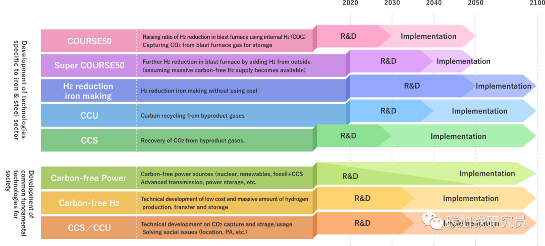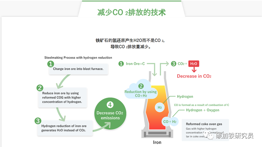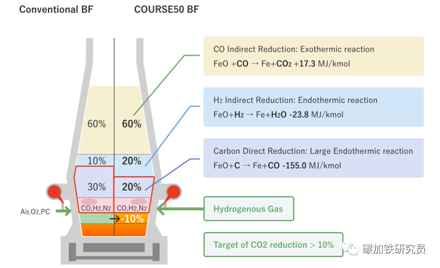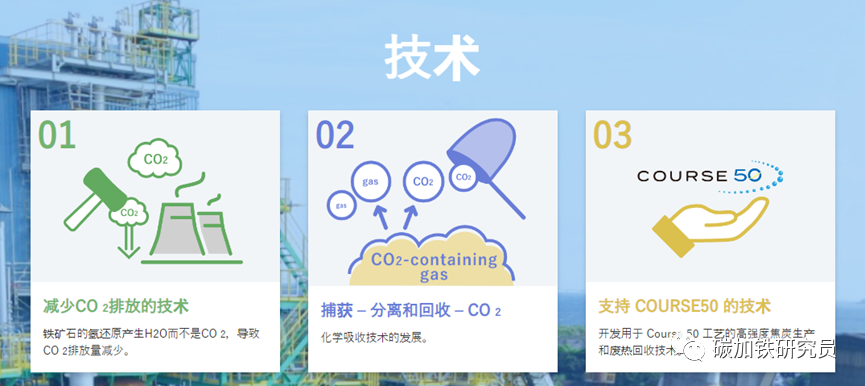 【汽车碳中和】日本钢协碳中和战略 2014年11月,日本钢铁联盟(JISF)发布了目标是2030年的“JISF对低碳社会的承诺第二阶段(现称为碳中和行动计划第二阶段)”。这一承诺也体现在日本基于《巴黎协定》制定的NDS,JISF的成员公司正在为实现这一目标而不断努力。2015年通过的《巴黎协定》显示,其目标是将全球变暖限制在远低于工业化前水平2摄氏度,最好是1.5摄氏度。2018年11月,JISF发布了《减缓气候变化的长期愿景:对零碳钢的挑战》(JISF长期愿景,文本,摘要),追求2030年后CO 2 零排放。在愿景中,JISF展示了实现2°C情景的前景以及钢铁制造中1.5°C情景的超级创新技术的必要性。JISF 长期愿景还概述了日本钢铁生产中实现零 CO 2排放的路线图。该路线图显示了从已经在开发的COURSE50项目到旨在尽可能降低高炉CO 2排放的Super COURSE50,再到最终的零CO 2排放炼钢技术氢基炼钢的进步。 2021年2月15日,日本钢铁联合会宣布日本政府旨在实现2050年碳中和的日本钢铁业基本政策其中,日本钢铁行业支持日本到2050年实现碳中和的雄心勃勃的政策,并将积极应对碳中和的挑战,旨在为日本政府的政策做出贡献。 日本COUSRSE50项目介绍 COURSE50由日本国内四家钢铁相关企业代表NEDO(新能源产业技术综合开发机构)开发。 2007年5月,时任首相安倍晋三宣布的“酷地球50”倡议中,提出通过利用节能技术等实现环境保护与经济增长的兼容并蓄。为了实现这一目标,建立了“COURSE 50”或“Cool Earth 50 CO 2终极还原系统(COURSE50)项目”计划,并将其定位为“创新技术开发”之一。 课程 50 旨在开发通过抑制高炉 CO 2 排放以及从高炉煤气 (BFG) 中捕获(分离和回收)CO 2 将 CO 2 排放量减少约30 % 的技术,并通过大约。2030年,最终目标是到2050年实现工业化和转让已开发技术。NEDO*项目的第二步——“环境协调炼钢工艺技术开发”。已实施(2013 – 2017)(*新能源和产业技术发展组织)。该项目的下一阶段——“环境协调炼钢工艺技术开发”。正在进行中(2018 – 2023) 研究开发目标 高炉 CO 2 减排技术开发 1、开发氢气等还原剂还原铁矿石反应控制技术,降低高炉焦炭消耗。 2、开发生产高强度、高反应性氢还原焦炭的技术。 3、开发从高炉煤气 (BFG) 中捕获、分离和回收 CO 2的技术 4、开发从高炉煤气(BFG)中捕集、分离、回收CO 2的化学吸收和物理吸附技术。・开发通过强化未利用的废热的利用,有助于减少CO 2的捕集、分离、回收所需的能量的技术来自钢铁厂。 COURSE50于2008年开始基础技术开发,2013年建成试验高炉,目前正在进行实践研究。 1、减少CO2排放的技术 2、COURSE50 高炉中CO 2减排的概念 氧化铁还原有三种方式(CO间接还原、氢间接还原、碳直接还原)。其中,碳直接还原是一个非常大的吸热反应。在普通高炉中,反应以CO间接还原、氢气间接还原和碳直接还原的比例约为6:1:3进行。在高炉操作的漫长历史中,人们为降低通过提高CO间接还原的比例来提高碳直接还原的比例,这是一个放热反应,但现在的操作已经在接近热力学极限的条件下进行。因此,很难从目前的水平大幅减少CO 2 。 在COURSE50项目中,我们的目标是通过促进氢间接还原(这是比碳直接还原小得多的吸热反应)并降低碳直接还原的比例,将高炉CO 2排放量减少10%以上。COURSE50高炉正在研究从钢厂产生的COG(焦炉煤气)、来自外部的氢气(预计将来会大量使用)、去除CO 2 和H2O的回收炉顶煤气喷射的风口喷射效果,以及原材料反应性对碳消耗率的影响。 3、使用实验高炉进行验证实验 实验高炉于2015年9月建成,高约20m,内容积12m3。(她的内部容积约为日本主要商业高炉的1/400。她位于照片最左侧的蓝色建筑内)。经过两次热试,每年大约开展两次实验活动,到2021年1月已开展九次。一次活动周期约为30天,约40名成员分四组24小时进行实验工作三班倒。 操作时,铁水原料块矿、烧结矿和焦炭、还原剂的混合物从上方交替投入。同时,从底部的3个风口吹入热风和1000℃左右的氧气、直径75μm以下的煤粉和含氢还原剂气体,以还原块状矿石和烧结矿。此外,每 2 小时从位于炉膛的一个出钢口排出约 4000 公斤约 1450℃ 的铁水和炉渣(除块状矿石和烧结矿中的铁以外的贵重物品)。与她的碳消耗相关的各种数据是在大约30天的不间断运行中收集的。 JFE钢铁碳中和战略JFE 钢铁公司正致力于通过多轨方法到 2050 年实现碳中和,旨在发现具有最大实际应用潜力的高度创新技术。中期目标是到 2024 财年将 CO 2排放量(与 2013 财年的水平相比)减少 18%,到 2030 财年减少 30% 或更多。 从现在到 2030 年,这段时间将是向低碳工艺过渡的时期,此后 JFE 钢铁公司打算启动一段超级创新时期。在过渡期间,公司将通过更多地部署减排技术,稳步实现中期 CO 2减排目标。与此同时,研发计划将积极探索超级创新新技术的发现,以供未来应用。 在创新时期,JFE Steel 预计将实施一系列智能使用举措。其中包括早期实施碳回收高炉和直接还原铁方法,两者都结合了专有的碳回收技术,以及越来越多地应用碳捕获和利用(CCU)解决方案。JFE 钢铁公司还将与社区和工业综合体合作,寻求碳捕获和封存(CCS)解决方案,这些解决方案与其他超级创新举措一起,将为日益实现碳中和的世界做出贡献。 |