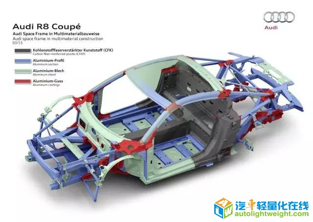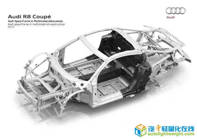 以奥迪R8为例,全部由铝材料打造而成。在R8的试验车上,运用碳纤维强化聚合材料(CFRP)零件,替换包括车顶,中间通道,后隔板,B柱和X形支架在内的、超过原车型50多个铝质部件。[color=rgb(51, 51, 51) !important]新材料的应用将全铝车身210kg的总质量降至198kg,同时,占车身总质量17%的新材料还将车身强度大幅提高。
