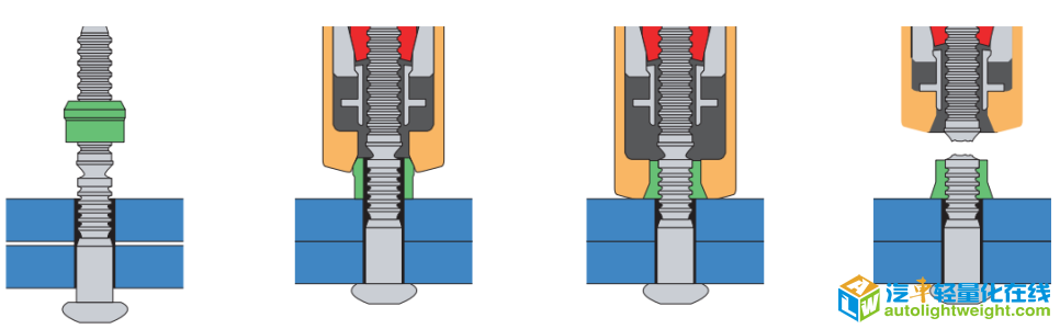1)主要特点与优势 客车的铝合金车身主要通过对原钢制客车车身及底架重新优化设计,使客车车身的五大片骨架(包括顶盖骨架,左、右侧围骨架,前、后围骨架)以铝合金材料取代原来的钢材,车身蒙皮(包括顶盖蒙皮和左右侧围蒙皮)以铝蒙皮取代原来的钢蒙皮,并保持或优于原碳钢车身结构的刚性和强度,以实现减重、防腐、节能减排、增加续航里程等目标。 铝合金车身的五大片采用专用截面铝型材,在满足车身附件安装要求的前提下,分别铆接组成独立总成。五大片之间以铆接形式连接。底盘车架仍采用碳钢结构,与铝车身之间采用铆接结构。前、后围蒙皮仍采用原结构(玻璃钢或薄钢板冲压),与铝车身的连接采用粘接为主,辅助拉铆。侧围蒙皮、顶盖蒙皮采用薄铝板粘接方式。 (1)减少焊接:采用铝合金车身骨架,取消了车身骨架及蒙皮焊接工序,只在铝车身骨架与底架合拢时焊接。焊接量大大减少,由焊接产生的污染排放也随之降低。 (2)取消电泳:铝合金车身具有天然的防腐性能,传统的电泳、防腐工序取消,减少污染;生产节拍加快,成本降低。 (3)HUCK铆接系统:铝车身骨架采用国际领先的全铆接结构:HUCK专利坚固系统。该结构广泛用于航空领域,一经安装,永不松动。 HUCK专利紧固系统示意图 (4)专用型材:该项目采用多种特殊截面铝型材,用于铝车身不同部位。 (5)精度提高:铝车身型材采用数控中心加工,精度大幅度提高。白车身精度相对原钢车身提高一倍。车身内外饰附件安装精度随之提高。 (6)整车降重效果明显:基础车白车身重量为4174.23kg;铝车身白车身重量为3773.393kg;实现白车身降重9.6%。 采用全铆接结构的铝车身城市客车,经有限元分析(静态/动态),涵盖静载、转弯、刹车、单轮悬空、双轮悬空等工况,以及模态分析等,并与钢车身进行比对应力、应变、位移和模态参数,整车强度、刚性和安全性能满足要求。样车经过26000公里强化路试验和3000公里一般公路试验,铝车身结构无出现一类二类故障。试验样车经拆解分析,铝车身骨架完好,无任何松动。