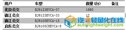 2 )国内外典型车企应用情况 全铝车身城市客车已批量投入市场运营近一年,铝车身未出现任何故障。表主要用户统计表